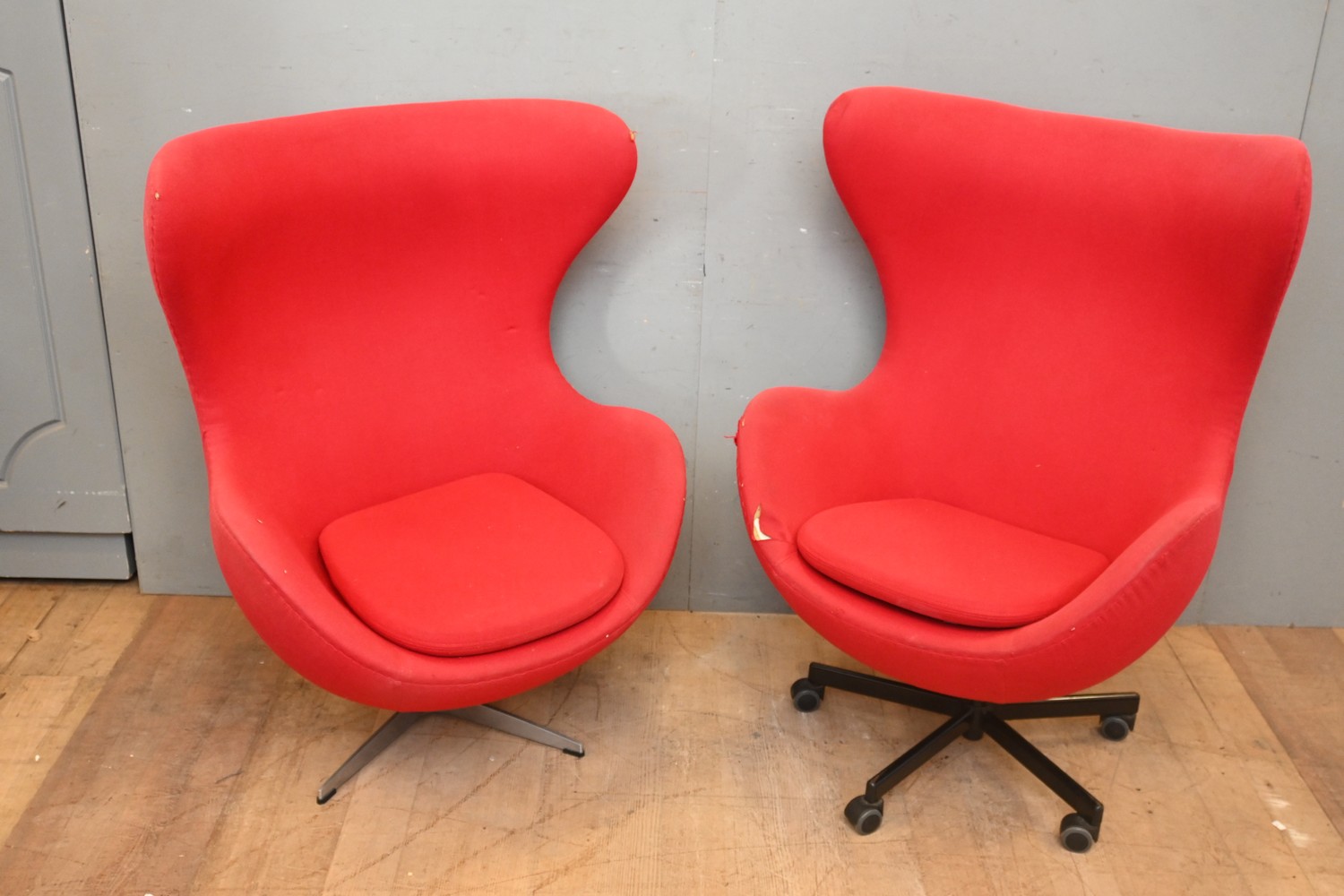 A PAIR OF RED EGG STYLE CHAIRS (A/F) (117H x 79W x 80D CM) (LEONARD JOEL DELIVERY SIZE: LARGE)