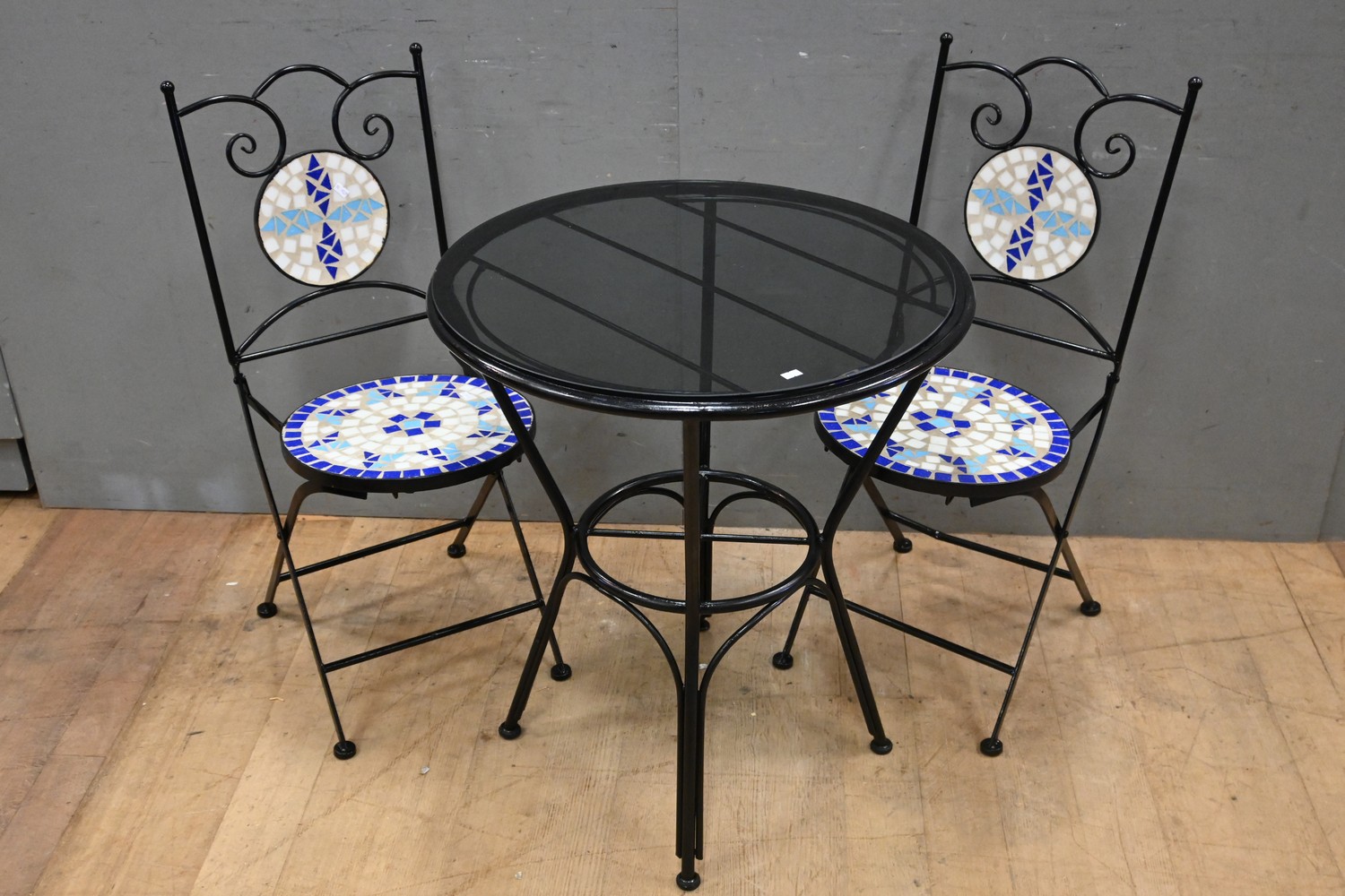 A THREE PIECE OUTDOOR SETTING WITH TILE INSET ( 77H X 66 DIAMETER CM) (LEONARD JOEL DELIVERY SIZE: LARGE)