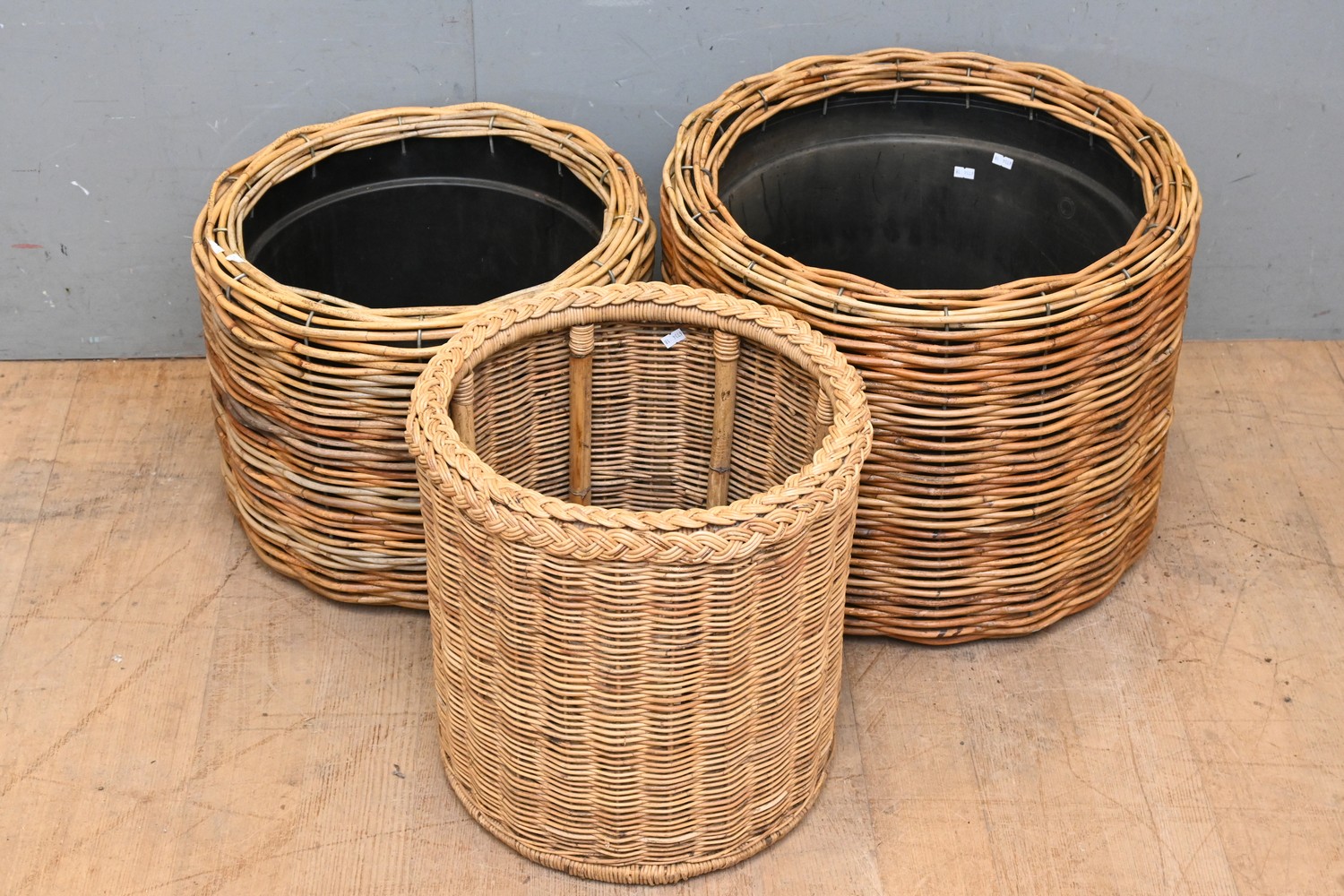 A COLLECTION OF THREE CANE PLANTERS (42H x 55D CM) (LEONARD JOEL DELIVERY SIZE: LARGE)