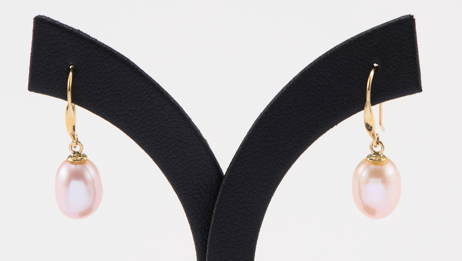 A PAIR OF PINK CULTURED PEARL EARRING TO 9CT GOLD SHEPARD HOOKS, DROP LENGTH APPROXIMATELY 25MM