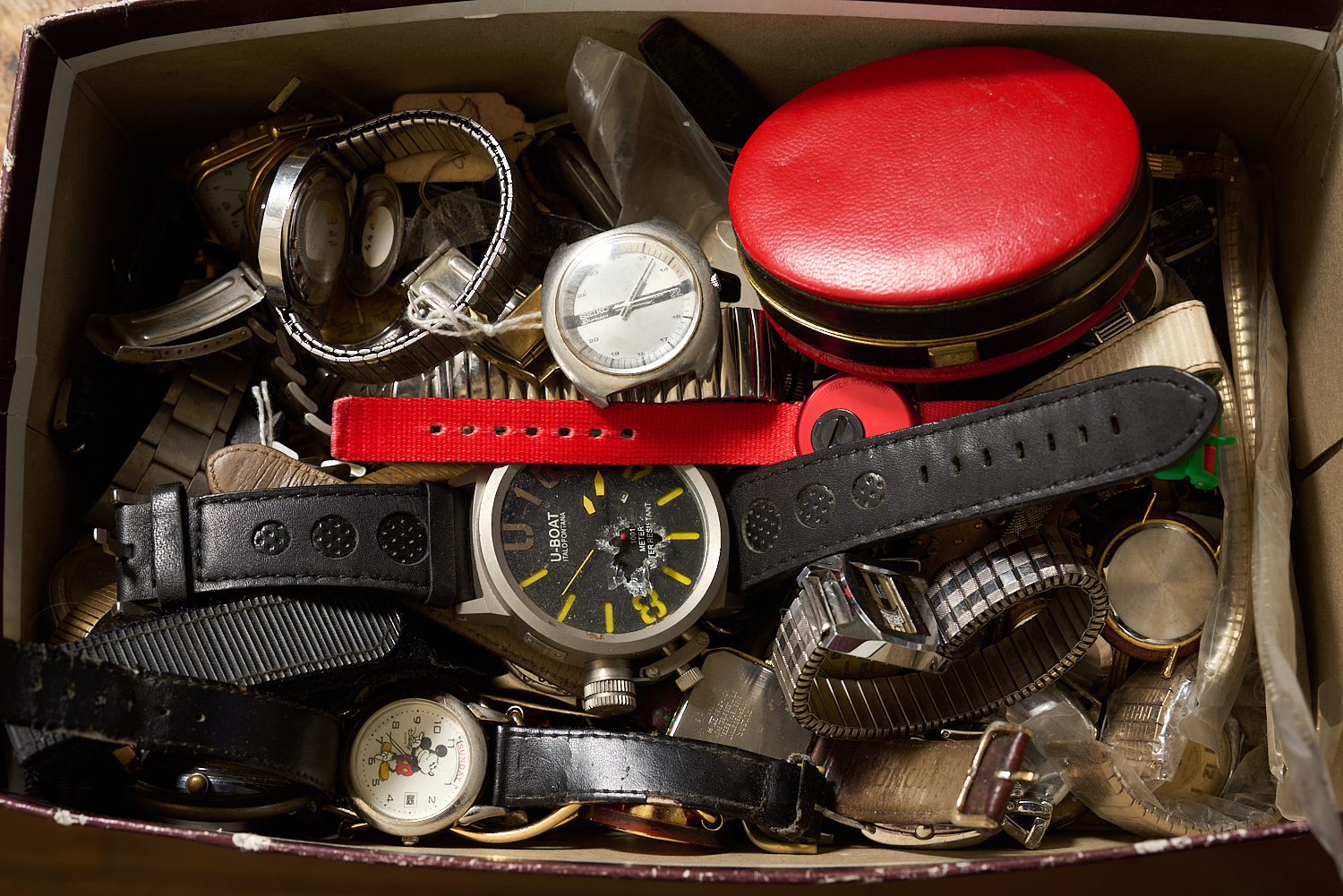 A BOX OF ASSORTED WATCHES (A/F), LEONARD JOEL LOCAL DELIVERY SIZE: SMALL