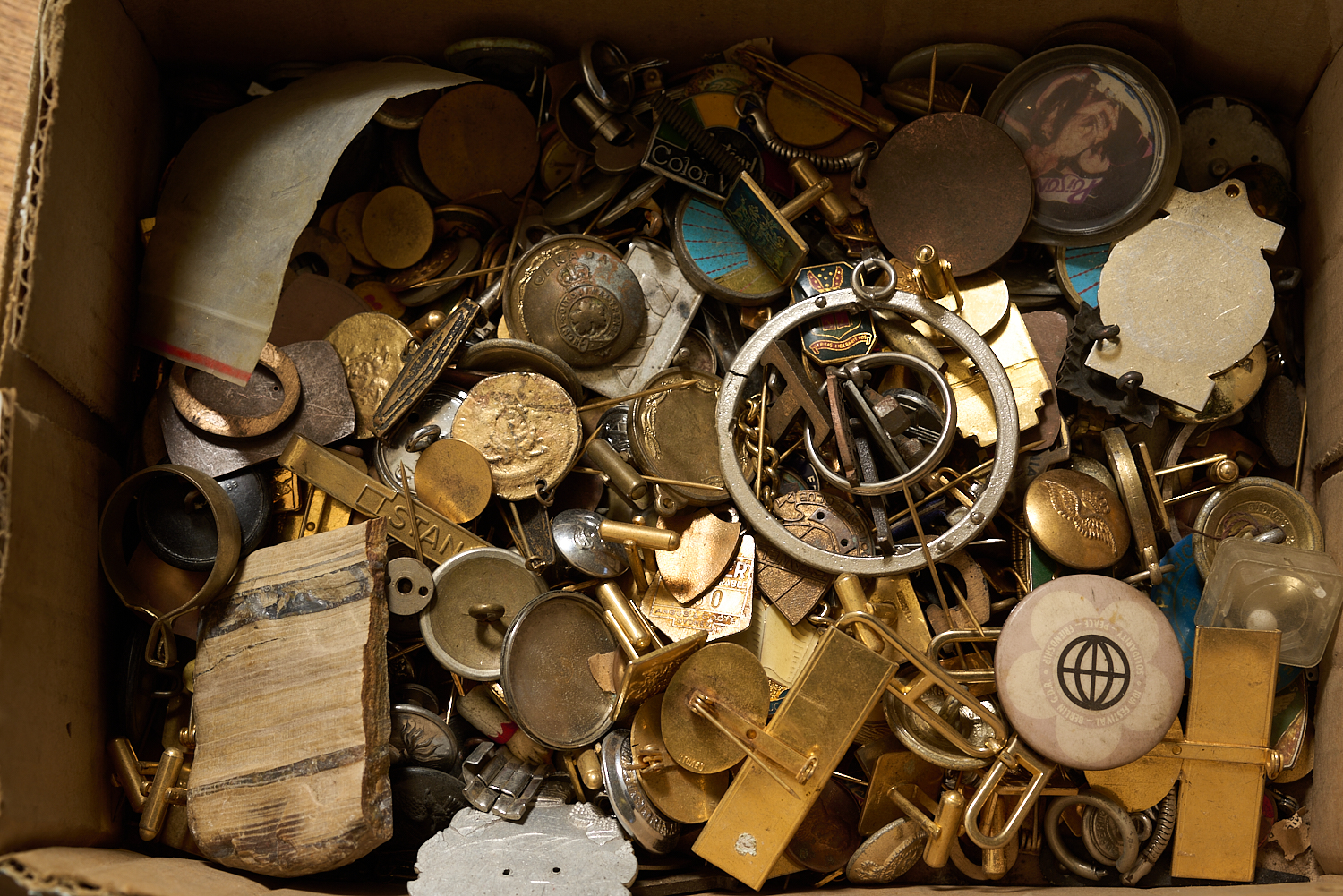 A BOX OF ASSORTED PINS, CUFFLINKS ETC. (A/F), LEONARD JOEL LOCAL DELIVERY SIZE: SMALL