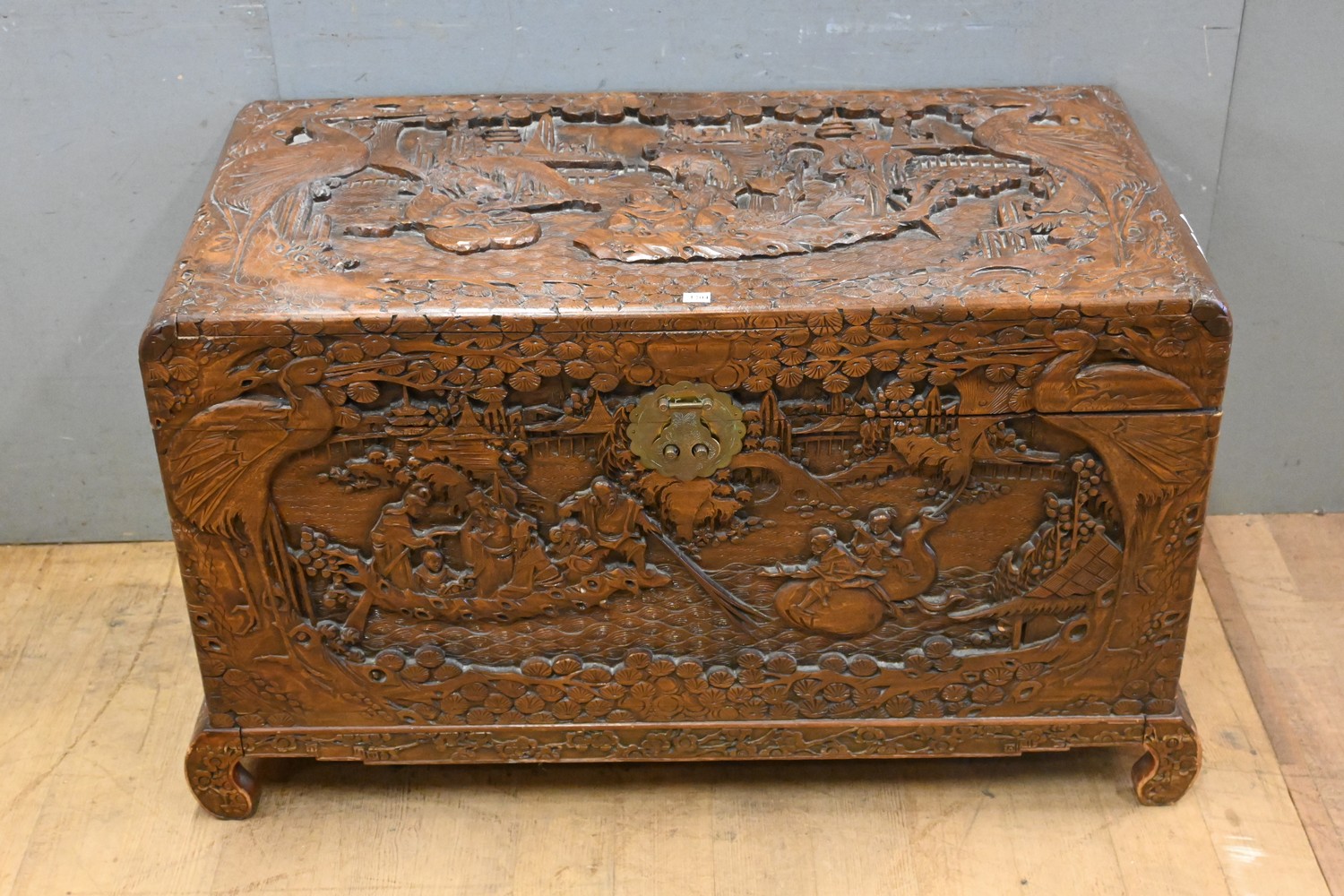 A DECORATIVELY CARVED CAMPHORWOOD CHEST (63H x 108W x 52D CM) (PLEASE NOTE THIS HEAVY ITEM MUST BE REMOVED BY CARRIERS AT THE CUSTOMER'S EXPENSE. LEONARD JOEL STAFF CANNOT ASSIST CARRYING THIS ITEM) (X-LARGE ITEM)
