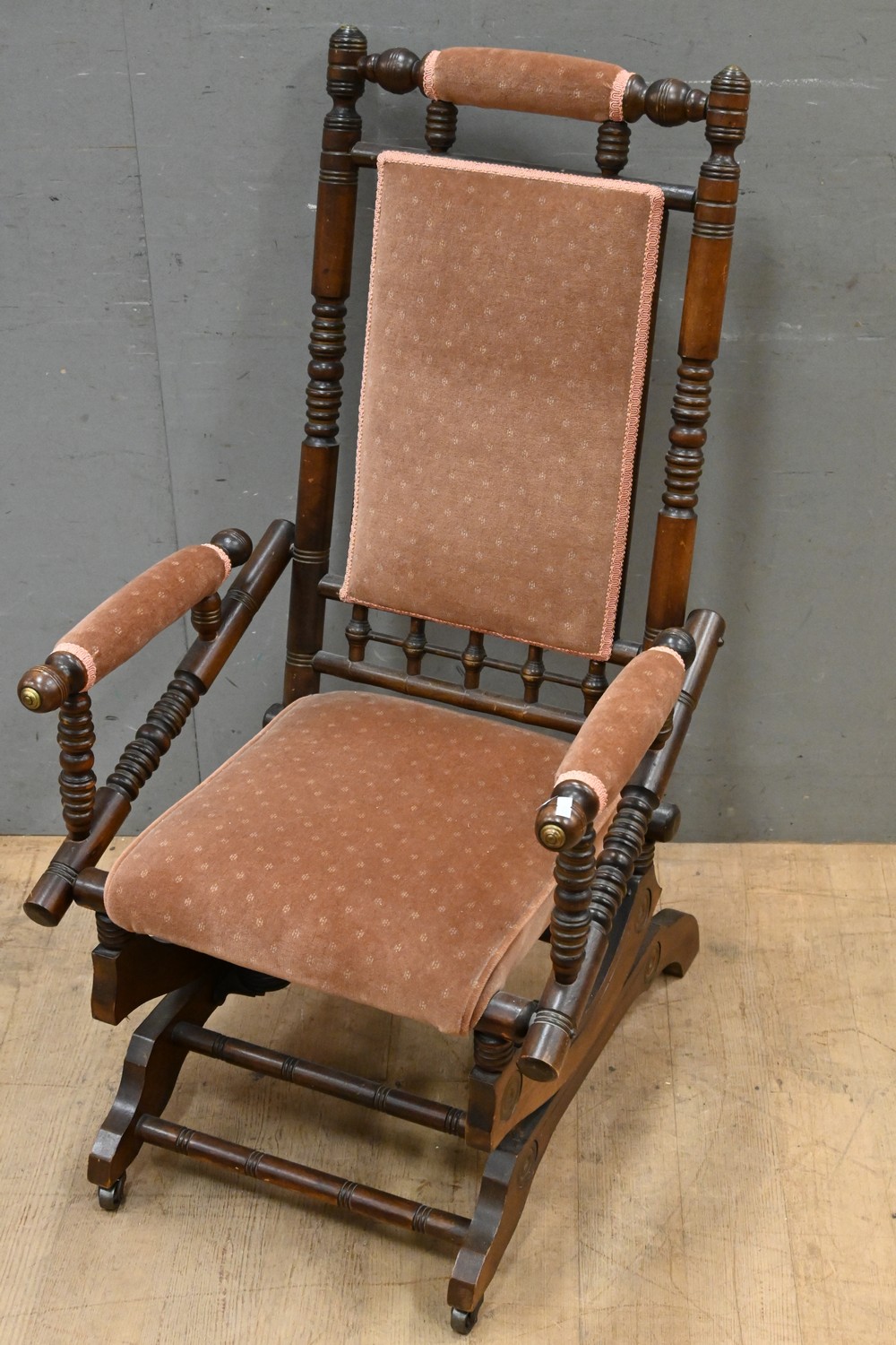 A VICTORIAN UPHOLSTERED ROCKING CHAIR (107H x 58W x 63D CM) (LEONARD JOEL DELIVERY SIZE: LARGE)