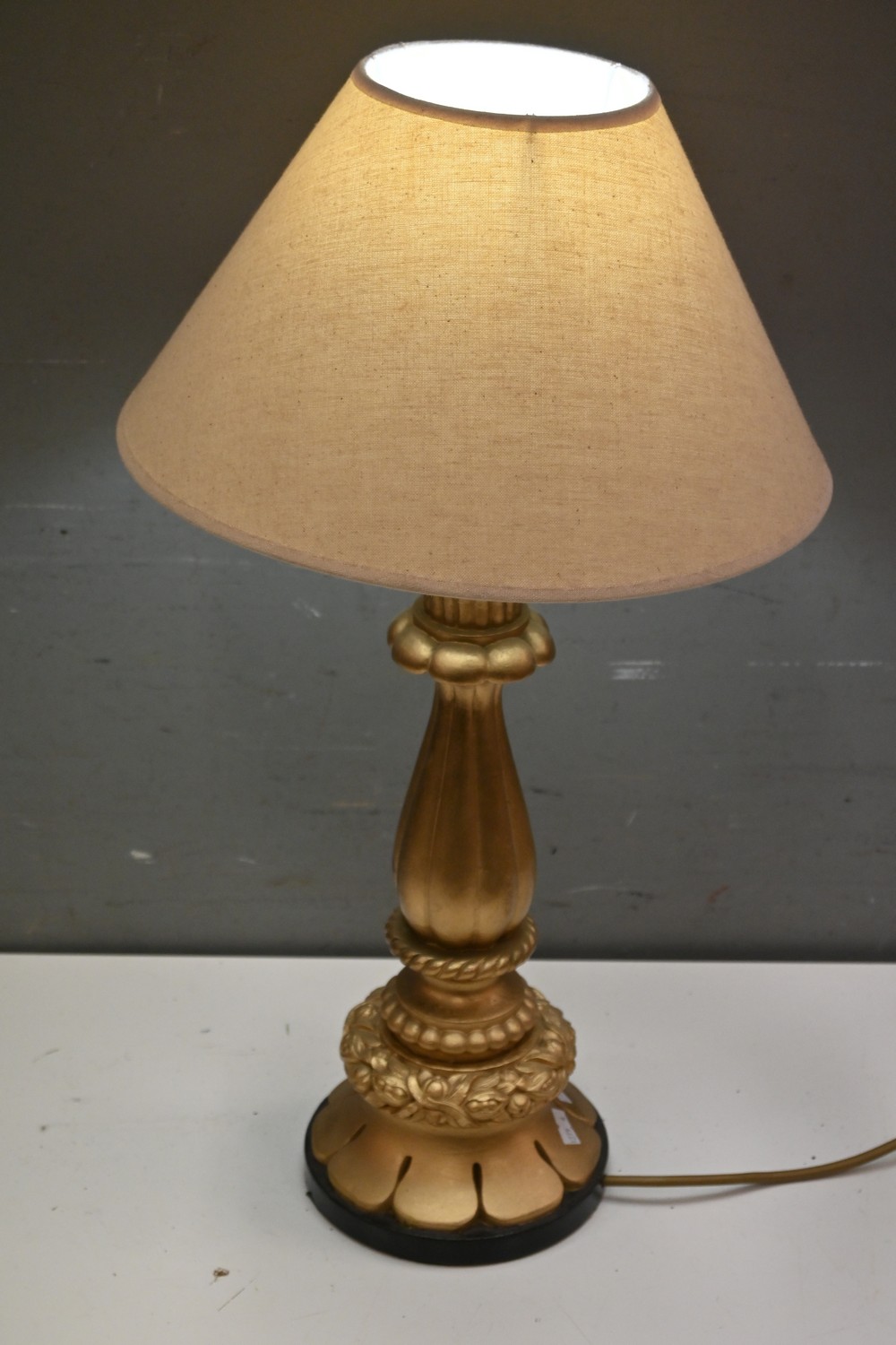 A GOLD PAINTED WOODEN BASED TABLE LAMP WITH SHADE (60H CM) (LEONARD JOEL DELIVERY SIZE: MEDIUM)