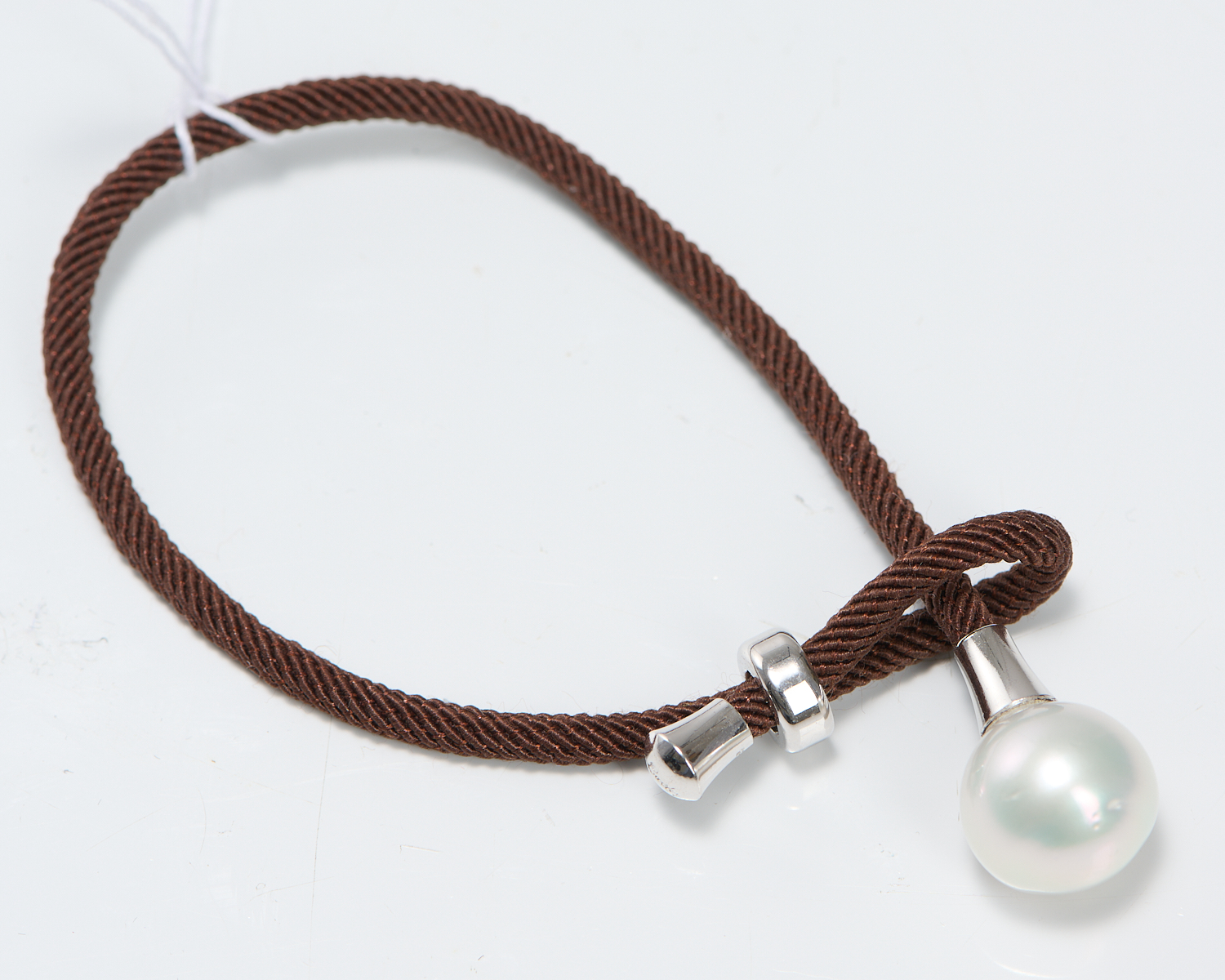 AN AUSTRALIAN SOUTH SEA PEARL BRACELET, TO AN AJDUSTABLE BROWN CORD WITH HARDWARE IN STERLING SILVER, THE PEARL MEASURING APPROXIMATELY 12.68MM