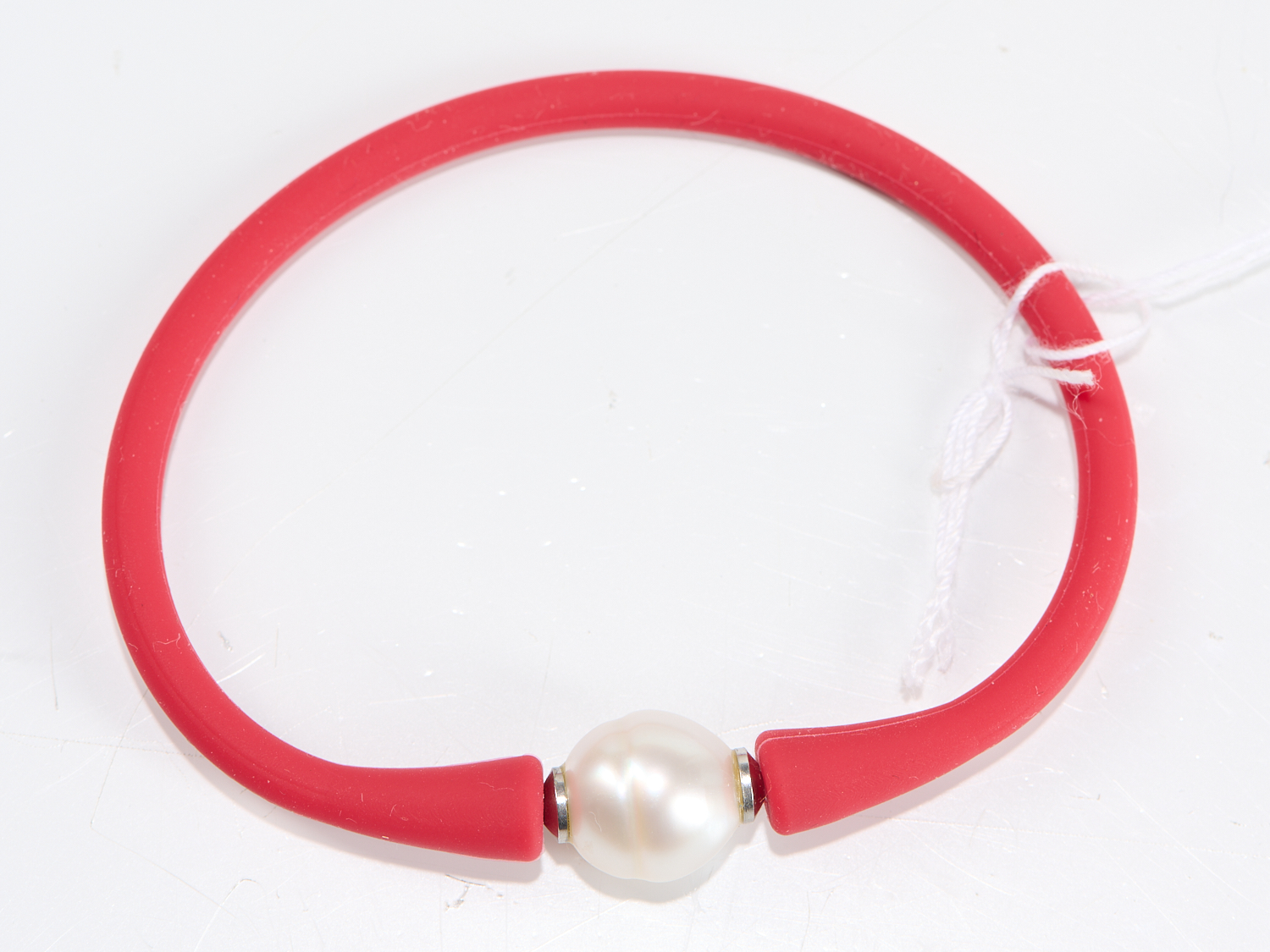 AN AUSTRALIAN SOUTH SEA PEARL TO A RED NEOPRENE BAND, THE PEARL APPROXIMATELY 11MM IN DIAMETER