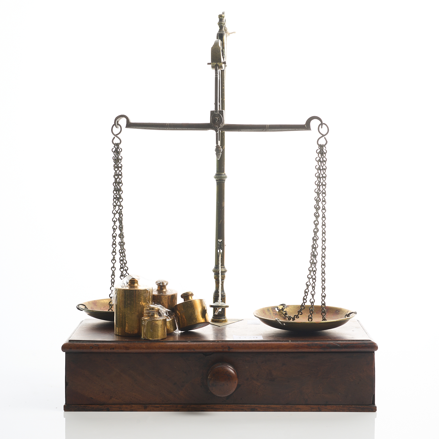 A SET OF SCALES ON A WOODEN BASE, TOGETHER WITH ASSORTED WEIGHTS, DEGRAVE SHORT & FANNER, LONDON H. 37CM X W. 26.5CM, LEONARD JOEL LOCAL DELIVERY SIZE: SMALL