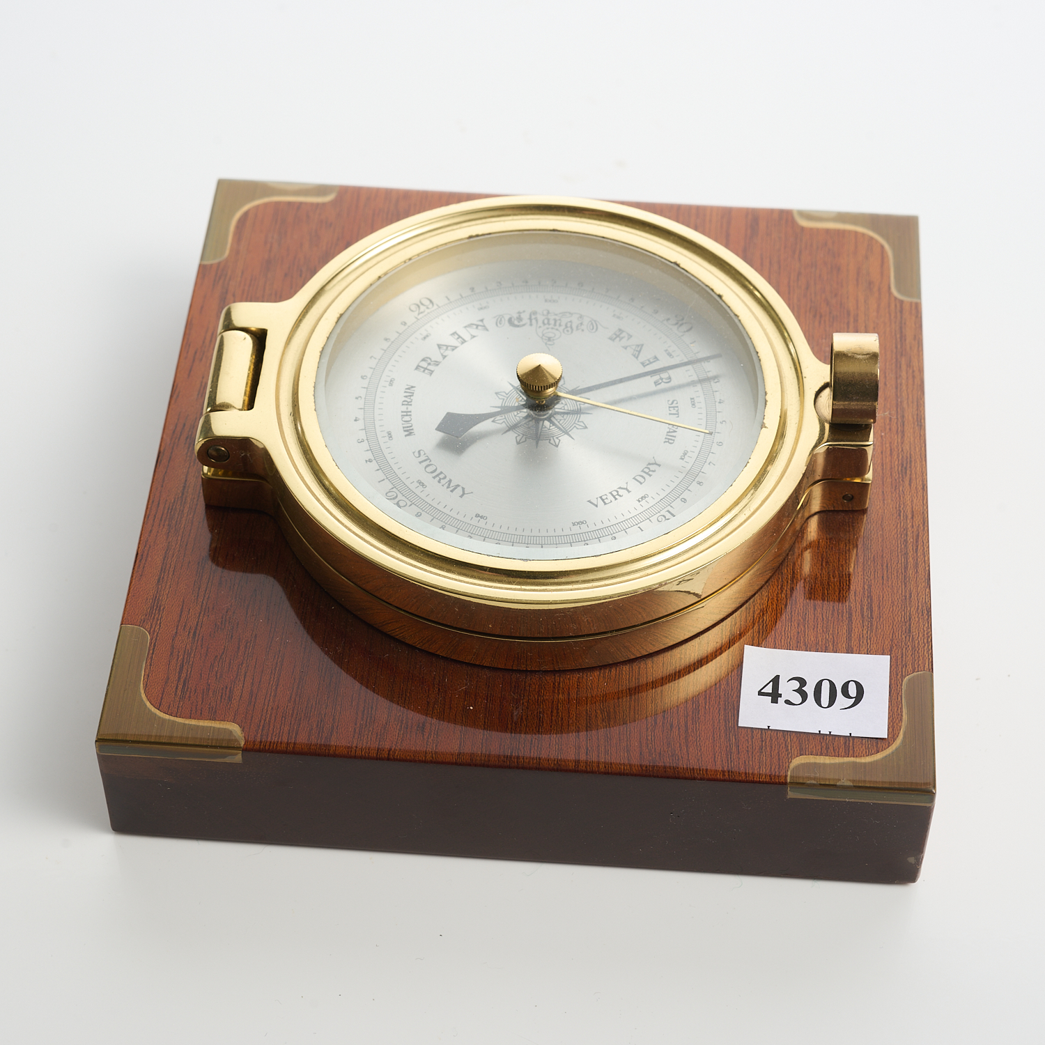 A BAROMETER ON A WOODEN BASE, W. 14CM X 14CM, LEONARD JOEL LOCAL DELIVERY SIZE: SMALL