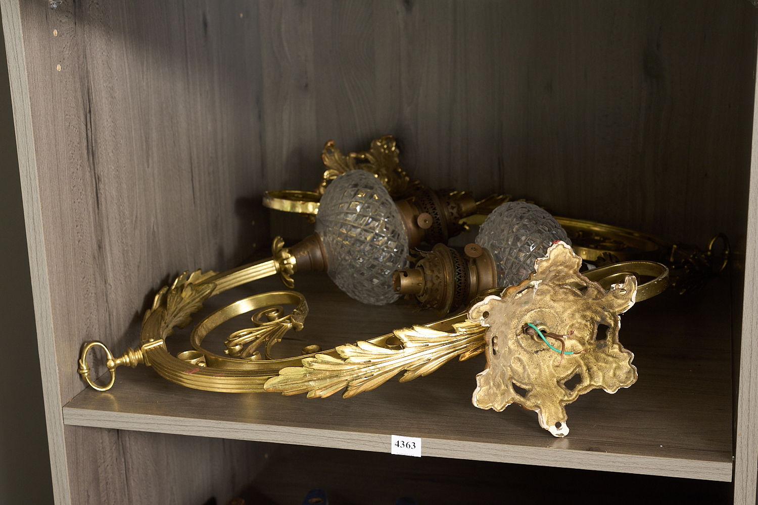 TWO BRASS AND CUT GLASS KEROSENE WALL SCONCES W.46CM, LEONARD JOEL LOCAL DELIVERY SIZE: MEDIUM