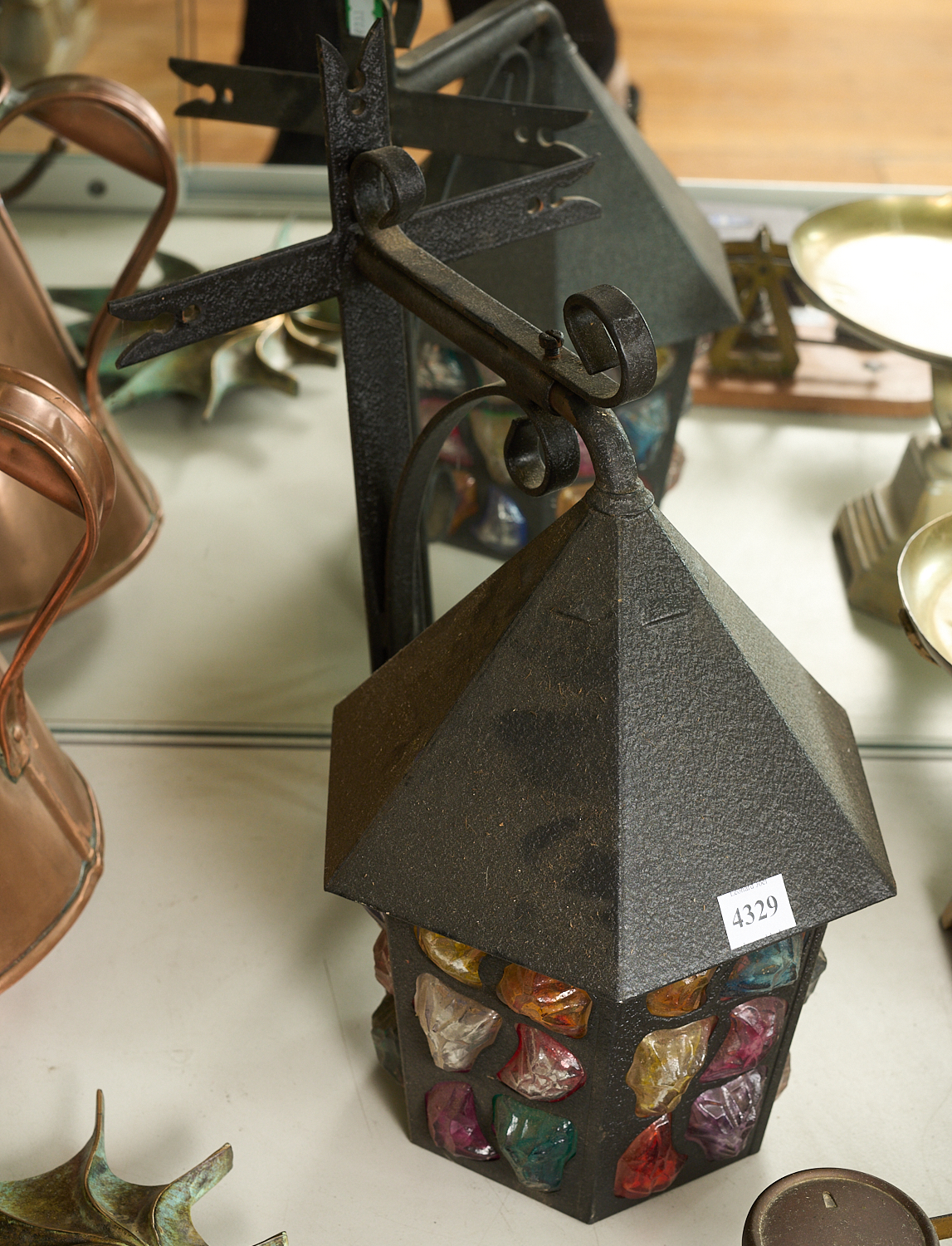 A WROUGHT IRON WALL LANTERN WITH COLOURED GLASS H.31CM, LEONARD JOEL LOCAL DELIVERY SIZE: MEDIUM