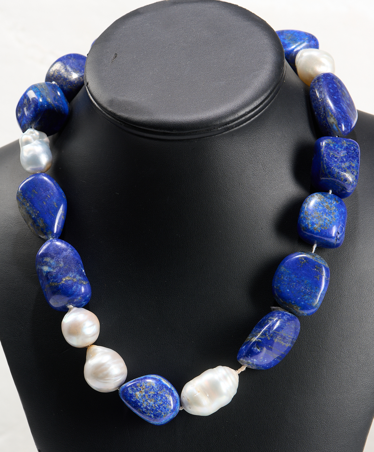 A LAPIS LAZULI AND BAROQUE SOUTH SEA PEARL NECKLACE TO A BAYONET CLASP IN 18CT WHITE GOLD