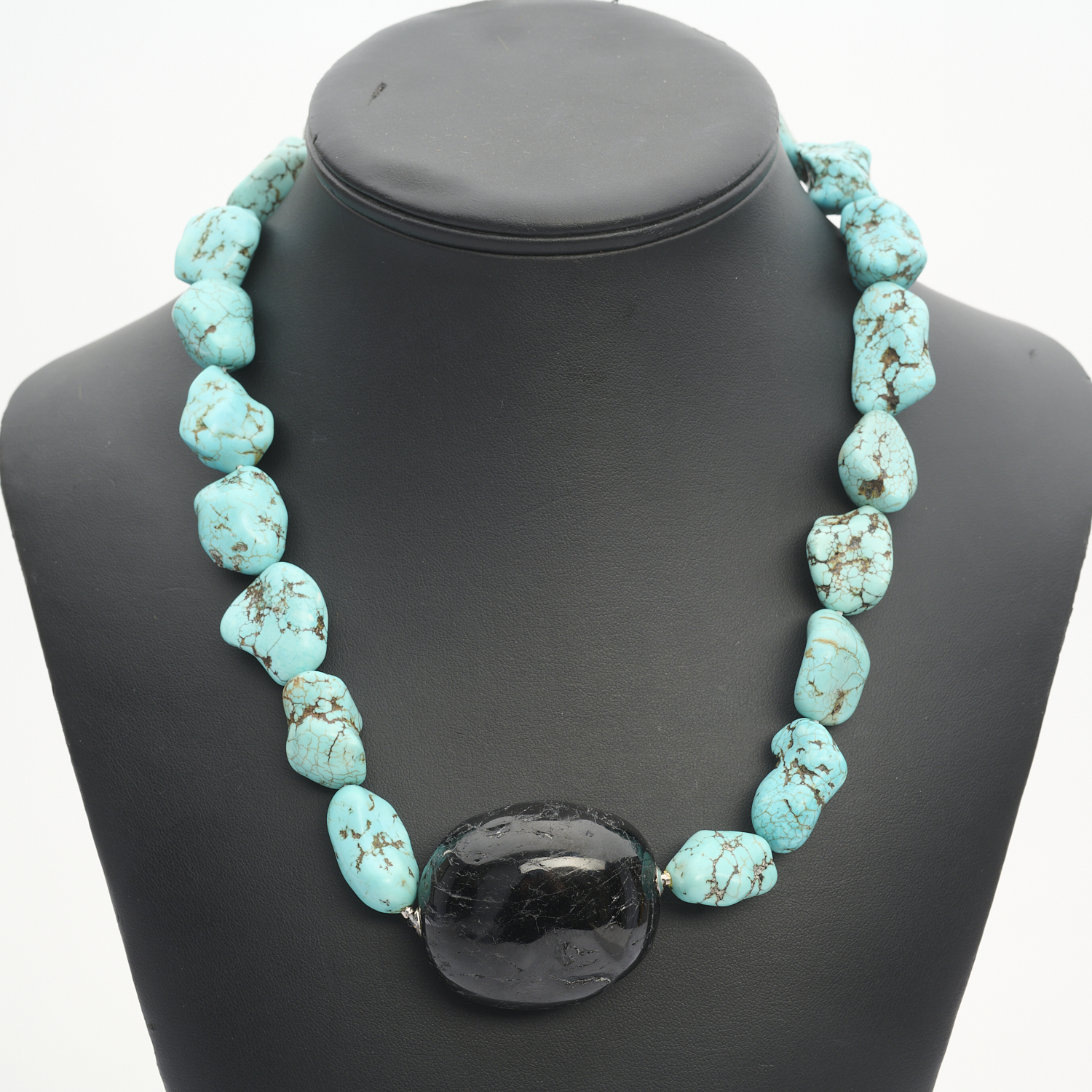 A TURQUOISE AND BLACK TOURMALINE NECKLACE, TO A BAYONET CLASP IN 18CT WHITE GOLD, THE TOURMALINE MEASURING APPROXIMATELY 49 X 45MM, TOTAL LENGTH APPROXIMATELY 530MM