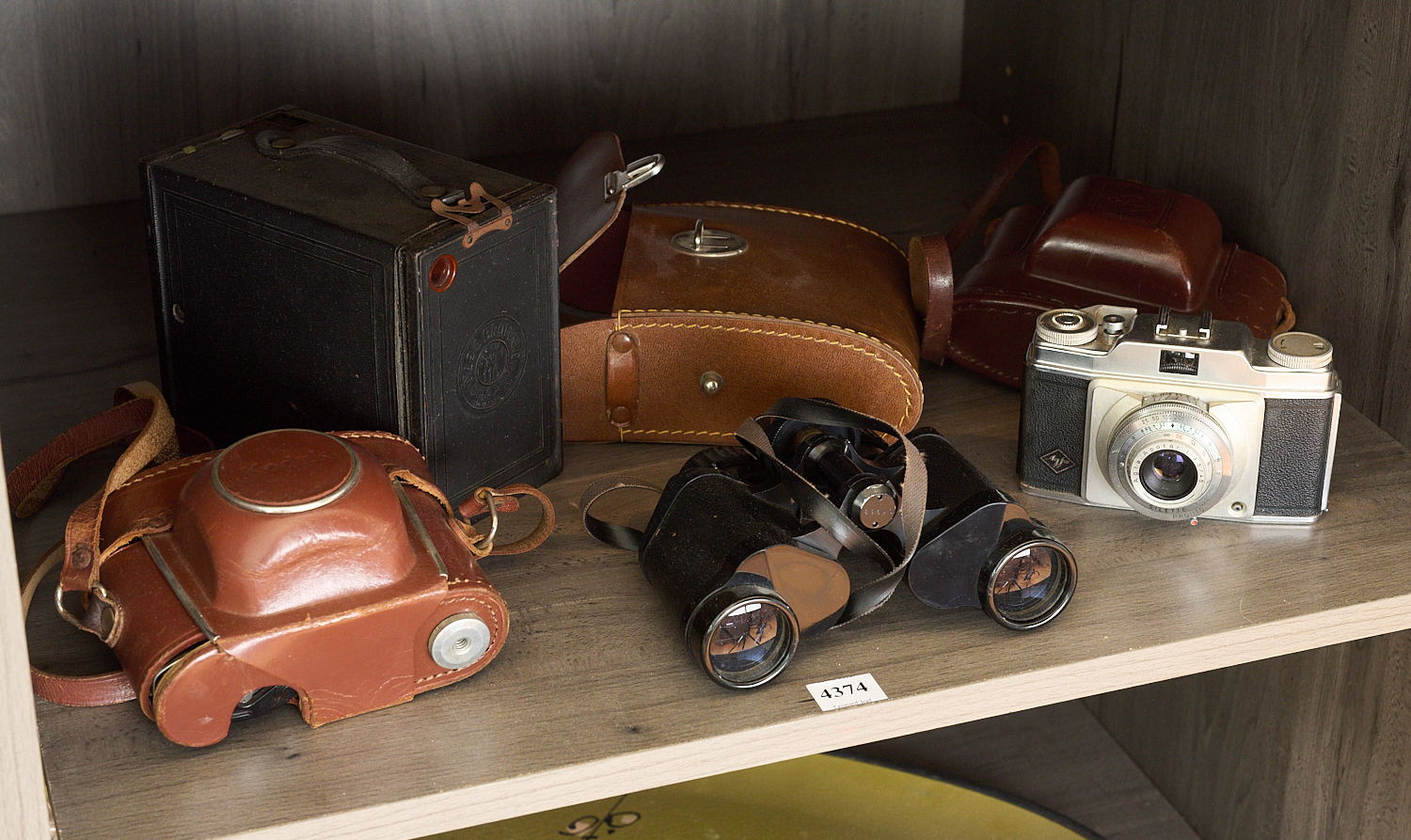 THREE VINTAGE CAMERAS AND A SET OF BINOCULARS, LEONARD JOEL LOCAL DELIVERY SIZE: MEDIUM
