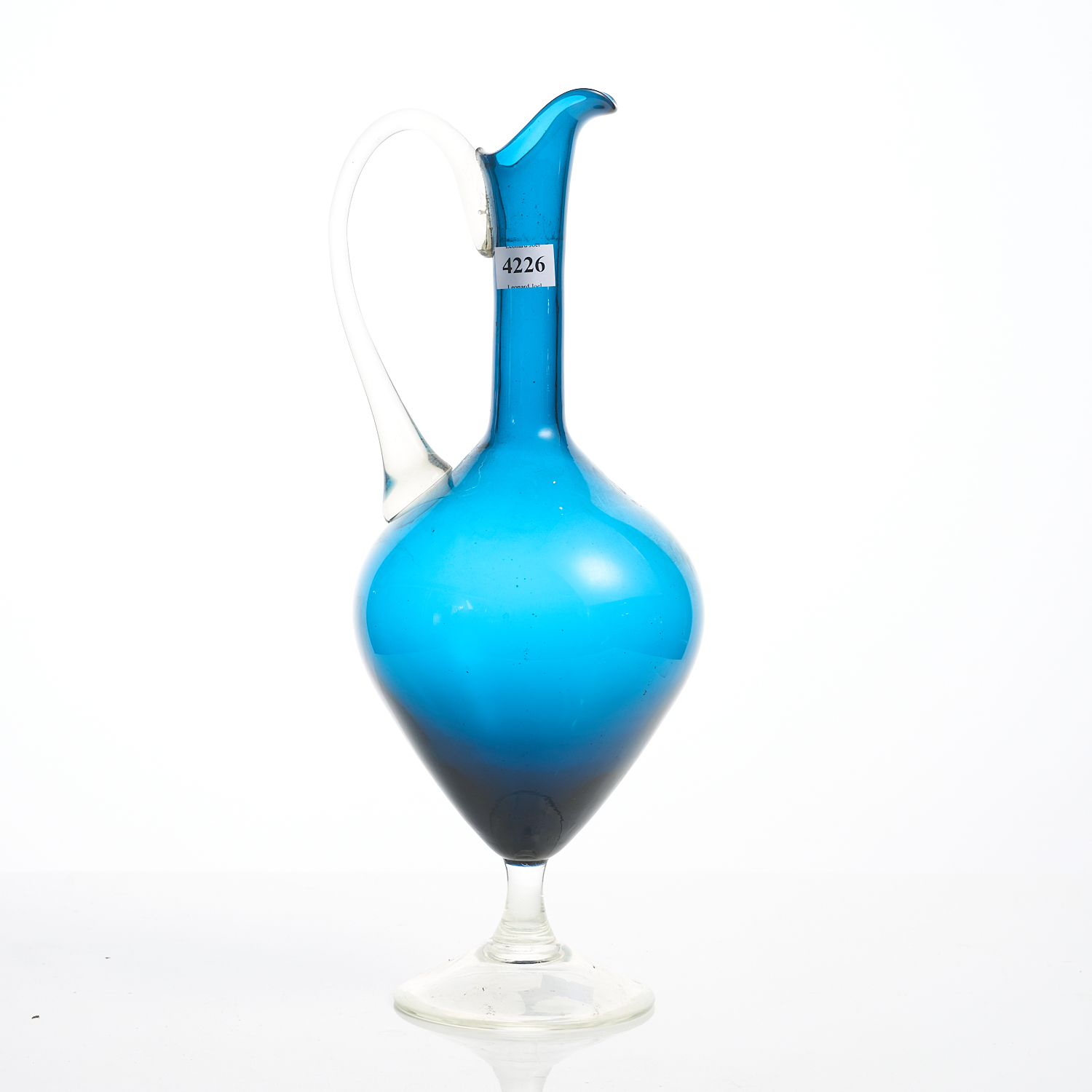 A TALL BLUE GLASS JUG H.38.5CM, LEONARD JOEL LOCAL DELIVERY SIZE: MEDIUM