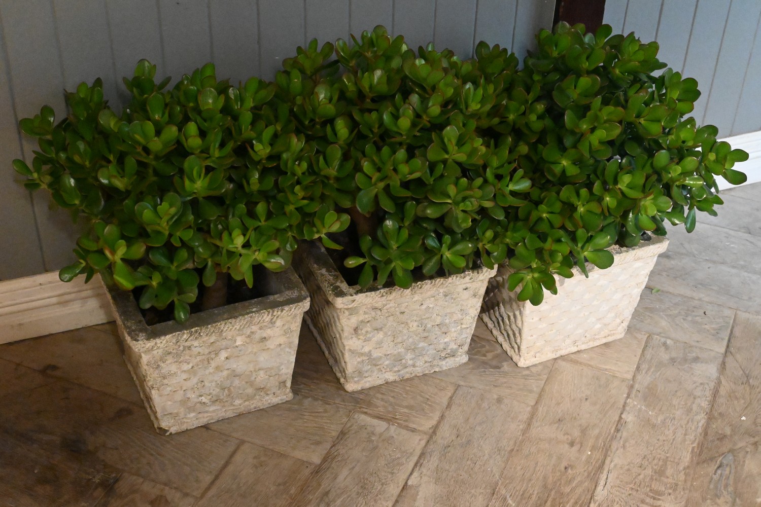 A COLLECTION OF THREE MONEY TREES IN LATTICE PATTERN CONCRETE POTS (25H x 31W x 31D CM) (PLEASE NOTE THIS HEAVY ITEM MUST BE REMOVED BY CARRIERS AT THE CUSTOMER'S EXPENSE. LEONARD JOEL STAFF CANNOT ASSIST CARRYING THIS ITEM) (X-LARGE ITEM)