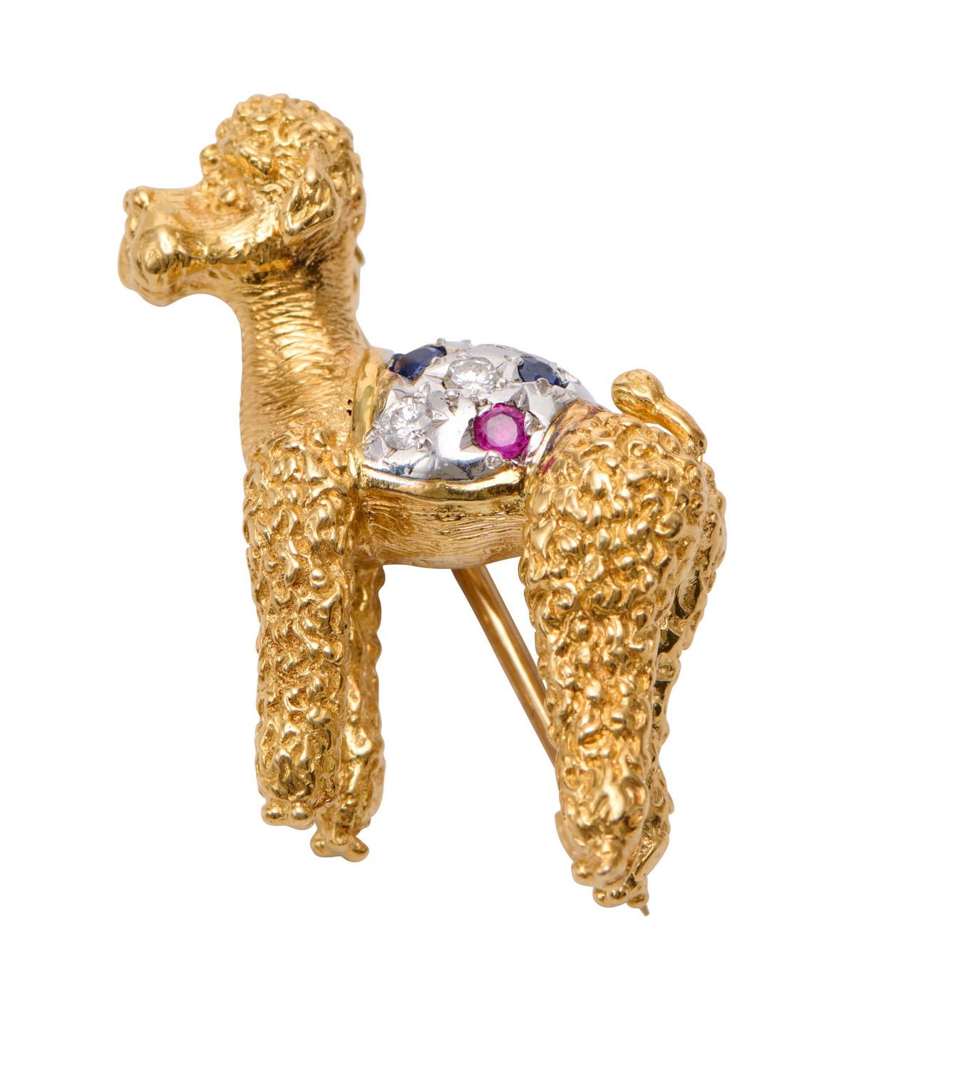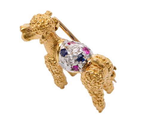 A GEM-SET BROOCH IN 18CT GOLD, IN THE FORM OF A POODLE, DETAILED WITH CIRCULAR-CUT SAPPHIRES, RUBIES AND DIAMONDS IN TEXTURED GOLD, LENGTH 32MM
