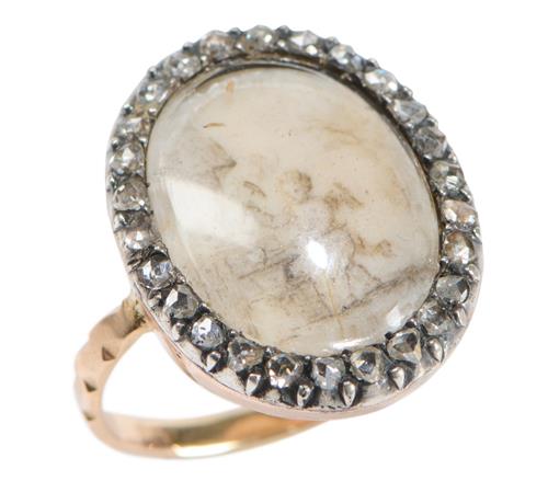 Composed of hand painted oval miniature depicting Cupid forging a heart, within a surround of rose-cut diamonds, ring size G 1/2.