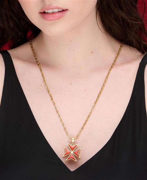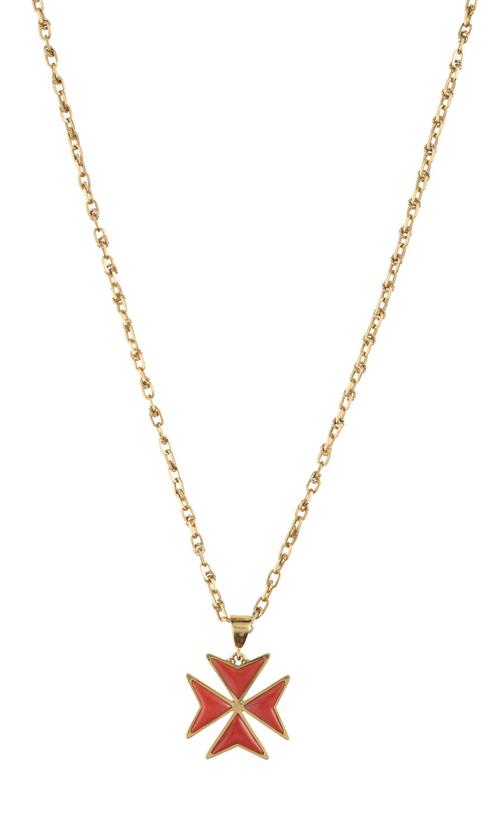 Designed as a Maltese cross set throughout with coral, to a fancy link long chain, length 720mm, pendant diameter 28mm, chain length 720mm.