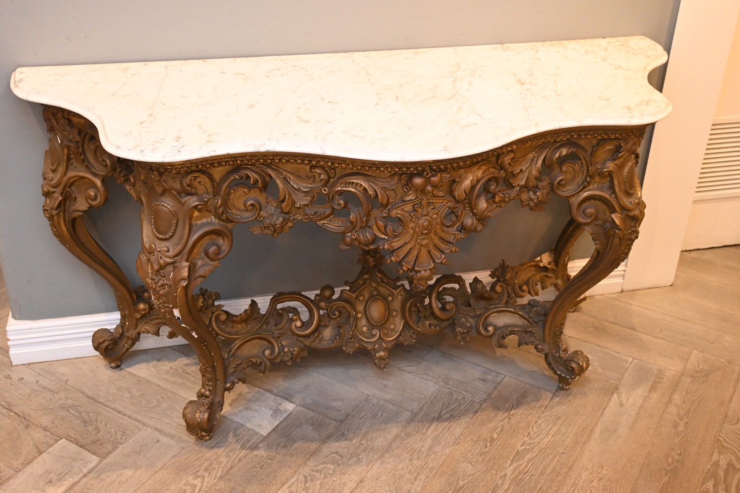A LOUIS XV STYLE MARBLE TOPPED CONSOLE (A/F) (H92 X W178 X D71 CM) (PLEASE NOTE THIS HEAVY ITEM MUST BE REMOVED BY CARRIERS AT THE CUSTOMER'S EXPENSE. LEONARD JOEL STAFF CANNOT ASSIST CARRYING THIS ITEM) (X-LARGE ITEM)