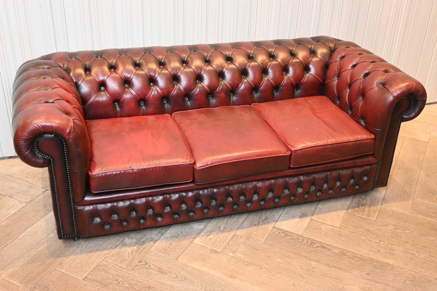 A CHESTERFIELD STYLE RED LEATHER THREE SEAT SOFA (A/F) (H70 X W204 X D94 CM) (PLEASE NOTE THIS HEAVY ITEM MUST BE REMOVED BY CARRIERS AT THE CUSTOMER'S EXPENSE. LEONARD JOEL STAFF CANNOT ASSIST CARRYING THIS ITEM) (X-LARGE ITEM)