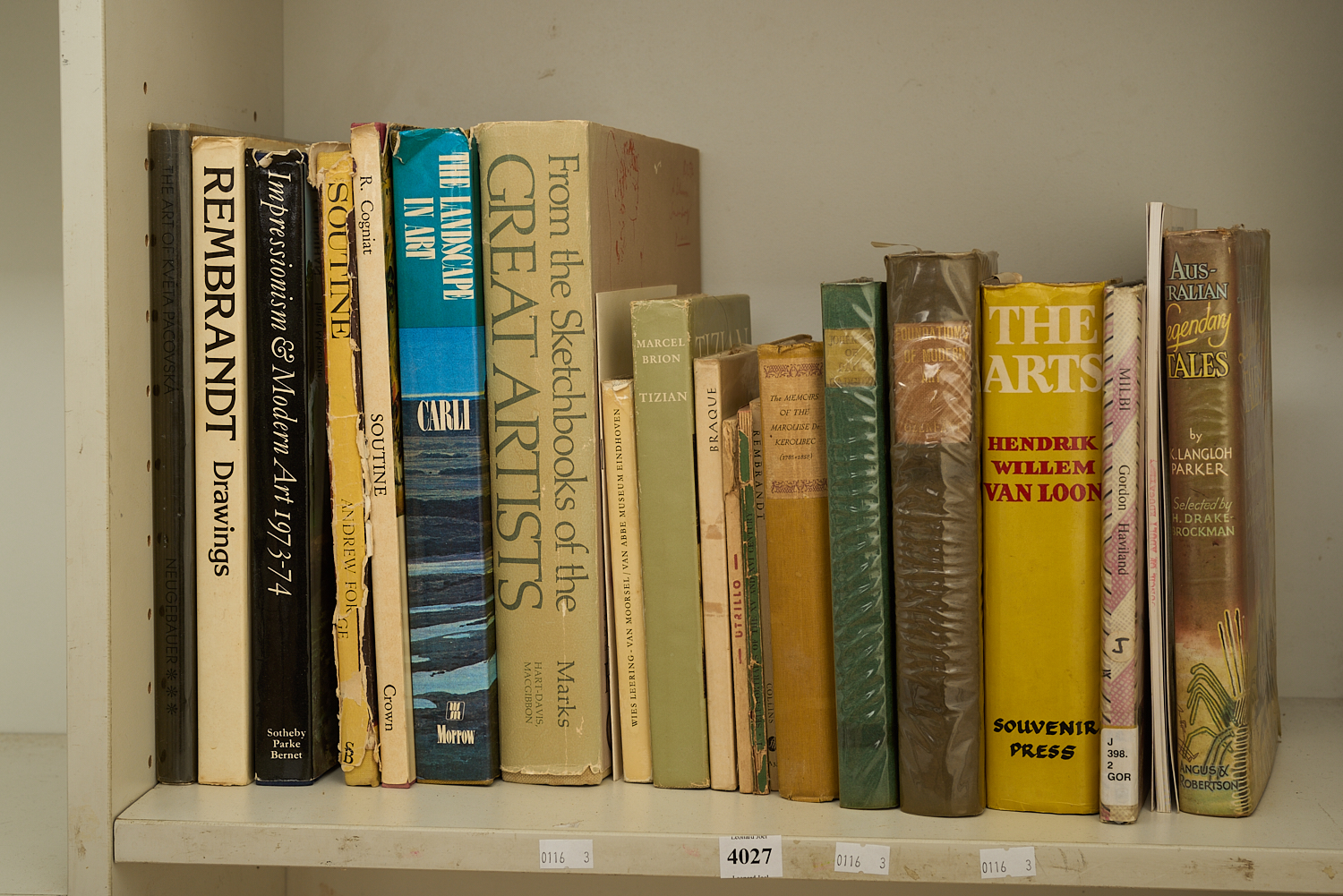 A SHELF OF BOOKS ON ART INCLUDING AUSTRALIAN LEGENDARY TALES, JOURNALS OF PAUL GAUGUIN, BRAQUE, LEONARD JOEL LOCAL DELIVERY SIZE: MEDIUM