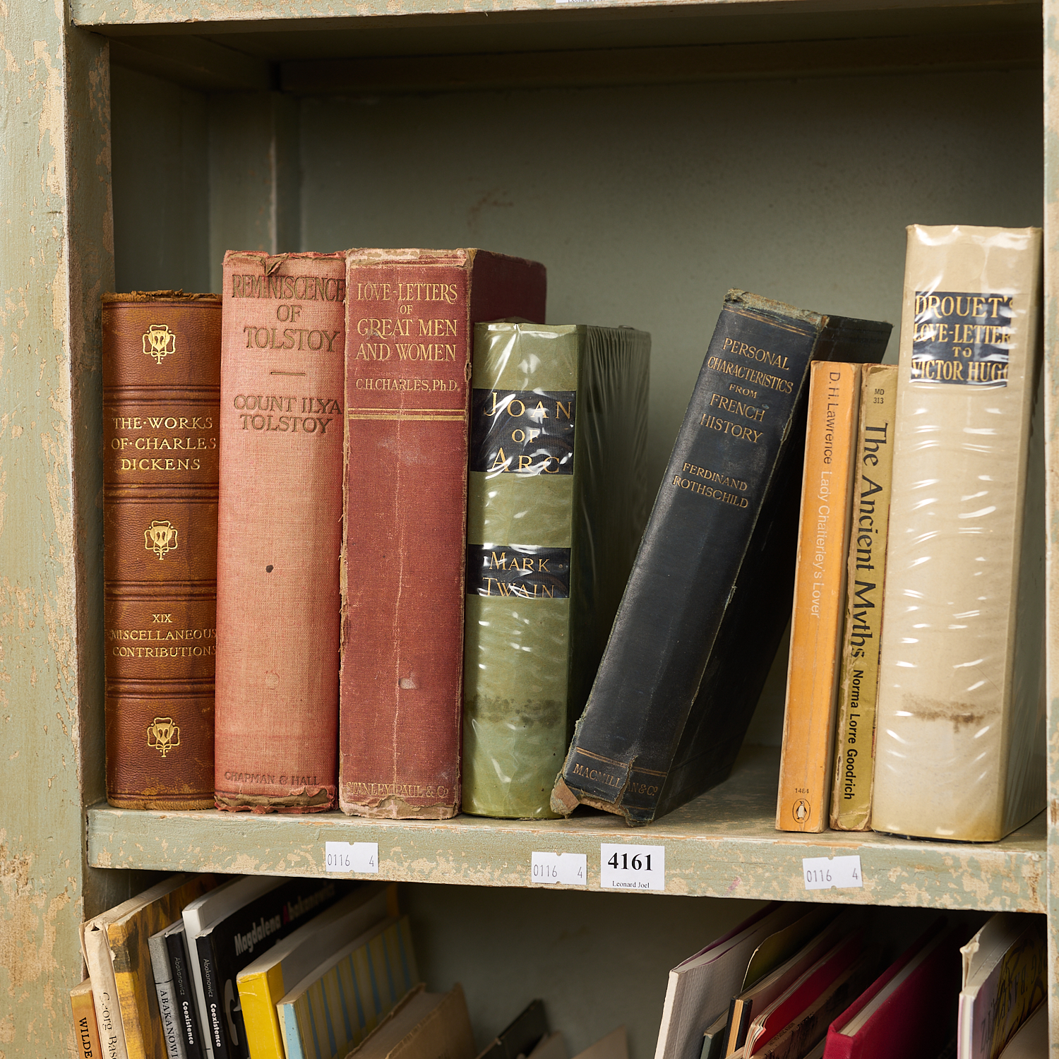 A PART SHELF OF BOOKS INCLUDING LOVE LETTERS OF GREAT MEN AND WOMEN, JOAN OF ARC, DROUET'S LOVE LETTERS TO VICTOR HUGO, LEONARD JOEL LOCAL DELIVERY SIZE: MEDIUM