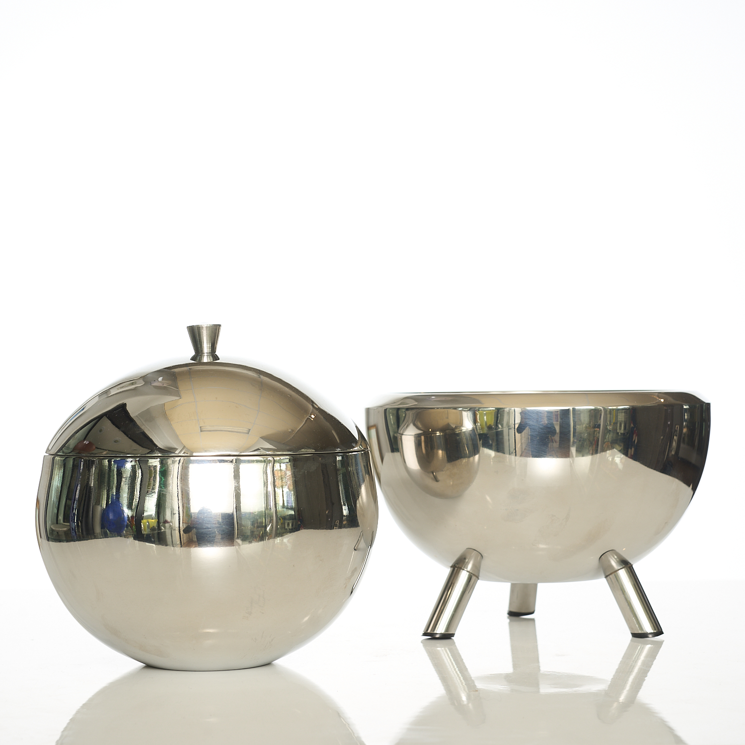A STAINLESS STEEL ICE BUCKET AND A TRIPOD FOOTED BOWL, H. 18CM, LEONARD JOEL LOCAL DELIVERY SIZE: MEDIUM