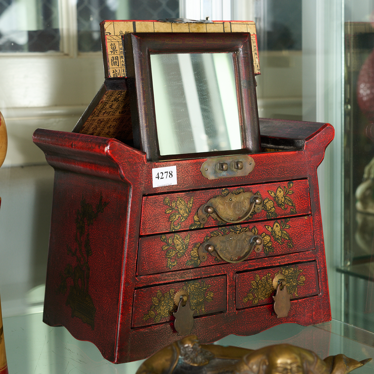 A CHINESE VANITY BOX WITH MIRROR AND BRASS MOUNTS, H. 20.5CM X W. 25CM X D.17CM, LEONARD JOEL LOCAL DELIVERY SIZE: MEDIUM