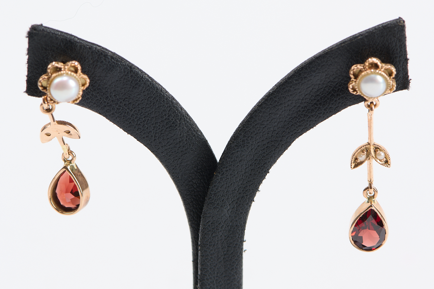 A PAIR OF GARNET AND PEARL SET EARRINGS IN 9CT GOLD, TO POST FITTINGS, 3.58GMS
