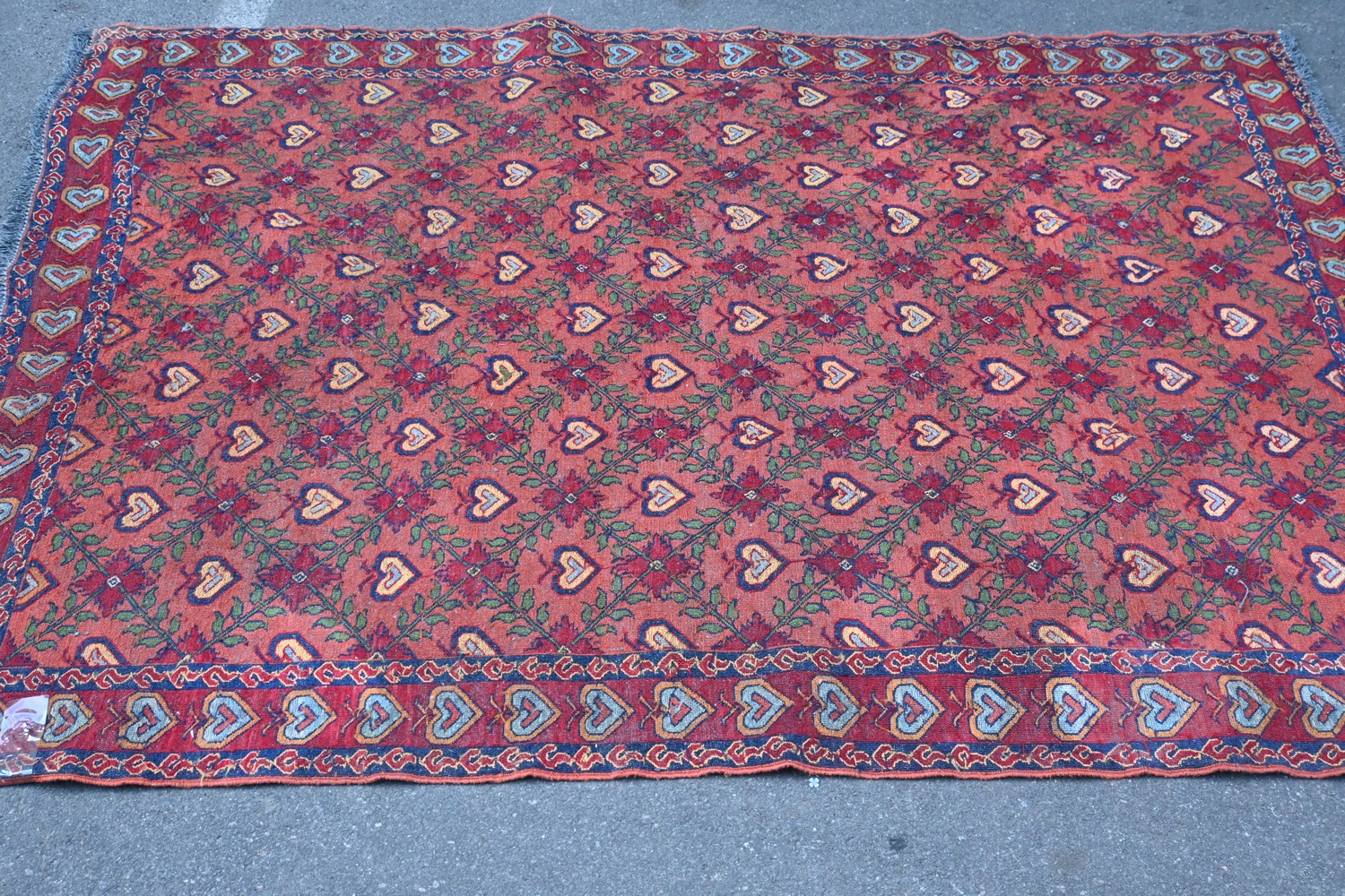A FLATWEAVE WOOLEN RUG WITH LOVE HEART MOTIF (A/F) (155 X 210CM)
