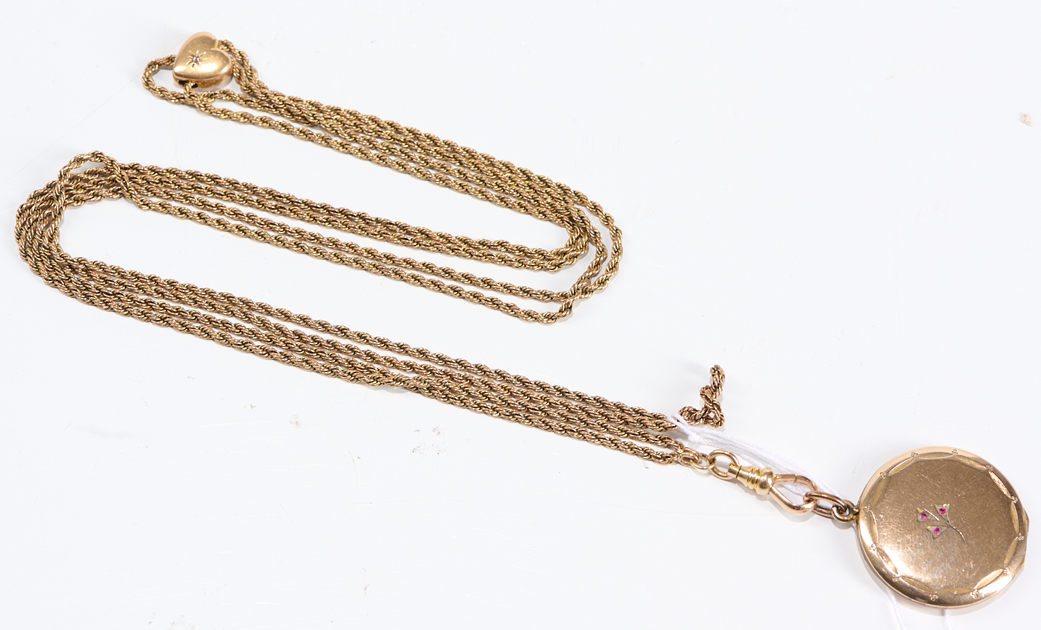 A ROPE SLIDE CHAIN IN GOLD LINED METAL, WITH A DIAMOND SET SLIDE AND GEM SET LOCKET IN LOW CARAT GOLD