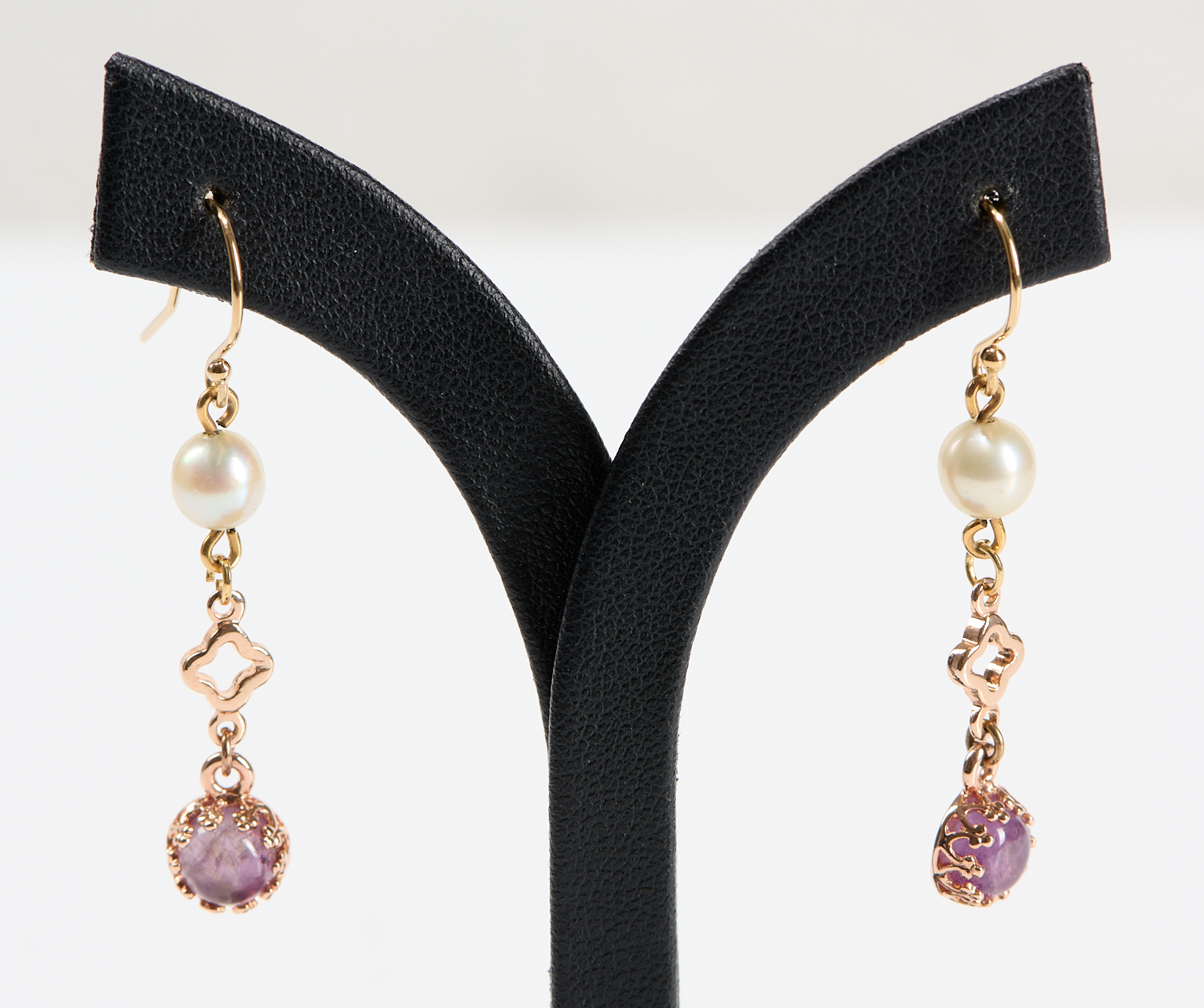 A PAIR OF CULTURED PEARL AND AMETHYST SET EARRINGS IN SILVER GILT, TO SHEPHERDS HOOK FITTINGS