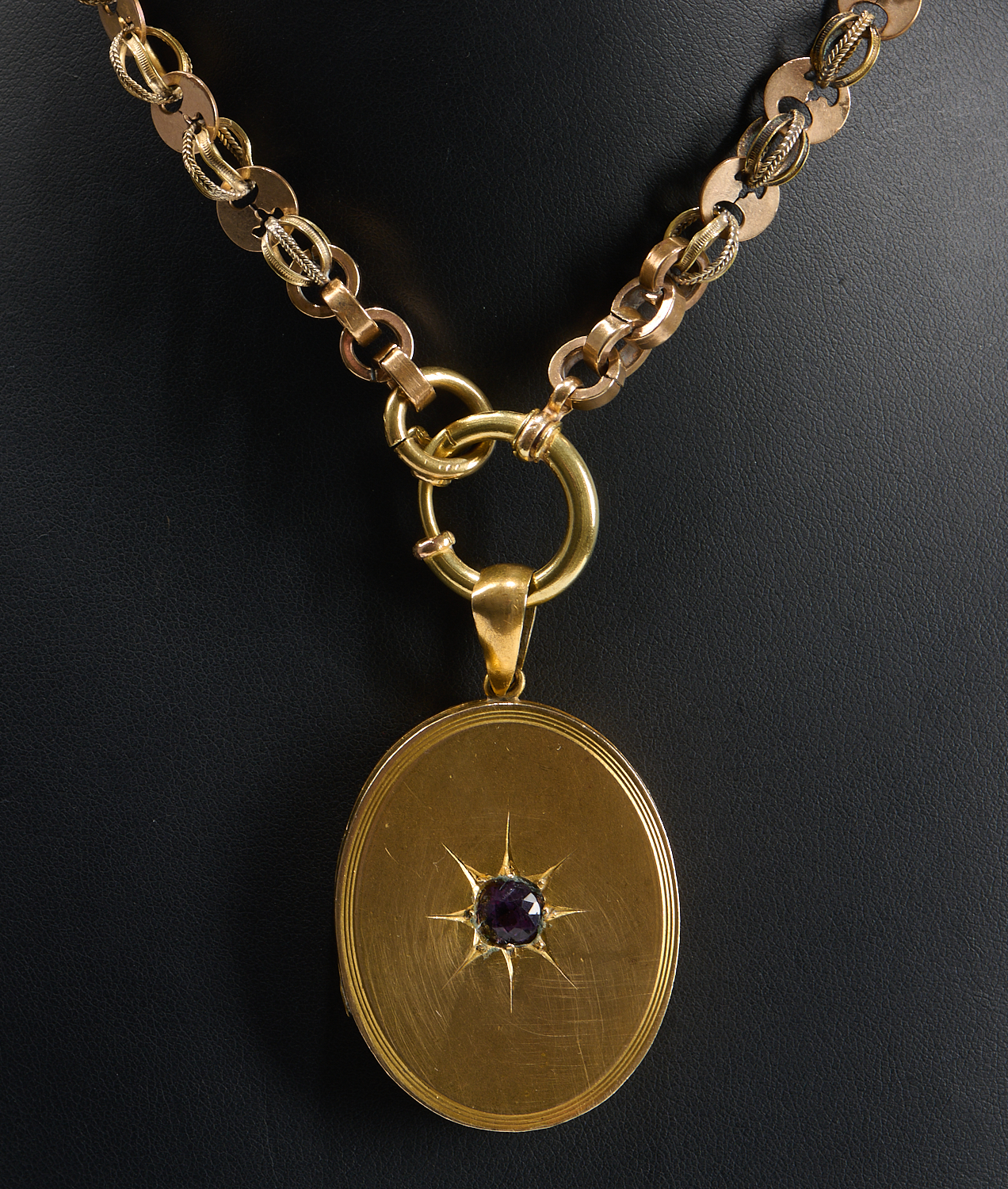 A VICTORIAN AMETHYST SET LOCKET AND CHAIN IN GOLD LINED METAL, THE LOCKET MEASURING 44 X 36MM