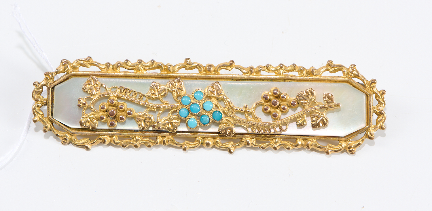 A VICTORIAN MOTHER OF PEARL AND TURQUOISE SET BOX BROOCH IN GOLD LINED METAL, LENGTH 82MM