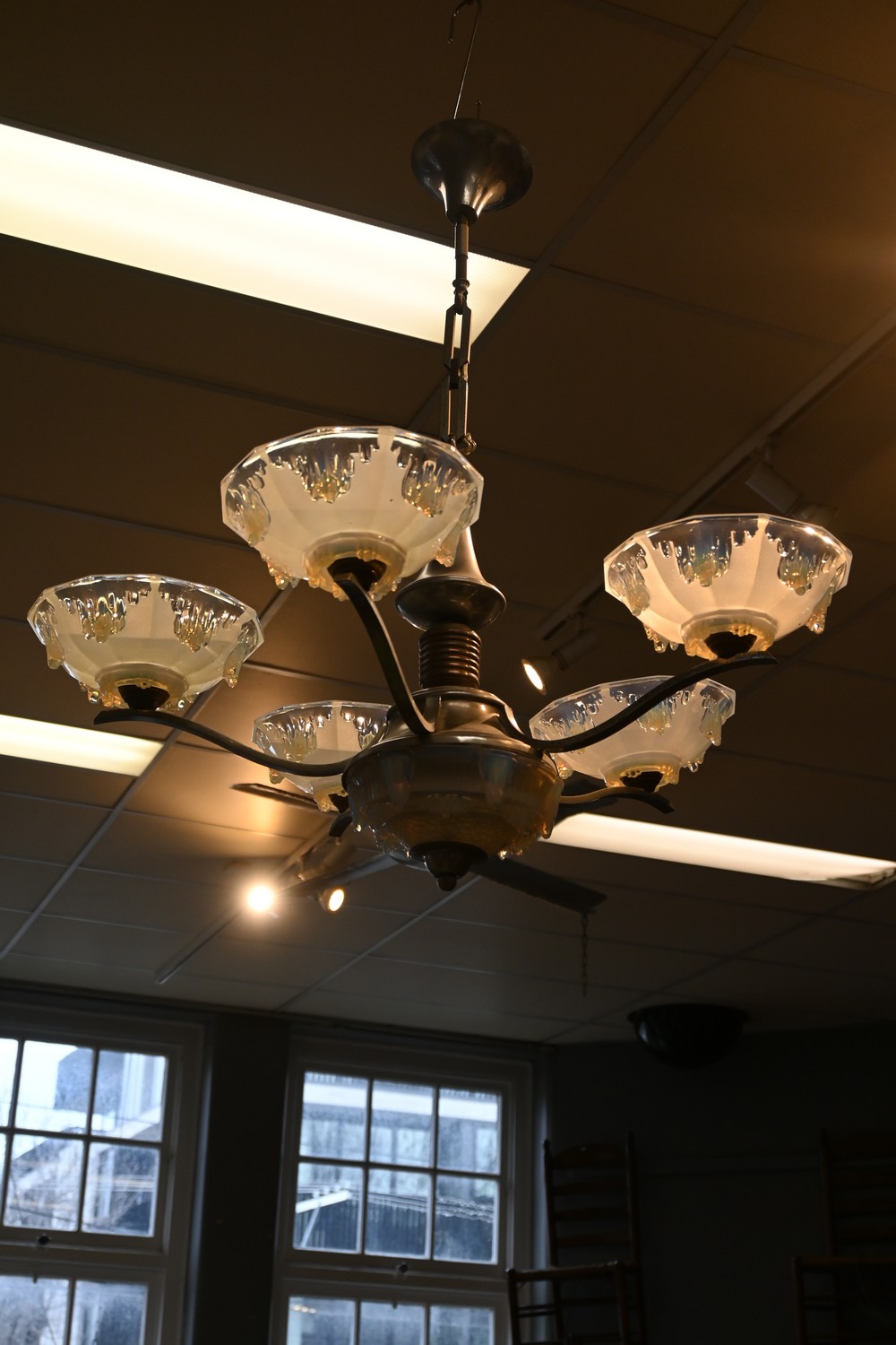 AN ART DECO OPALESSANT SABINO DESIGN FIVE BRANCH CHANDELIER CIRCA 1935 (H90 X D75 CM) (LEONARD JOEL DELIVERY SIZE: LARGE)