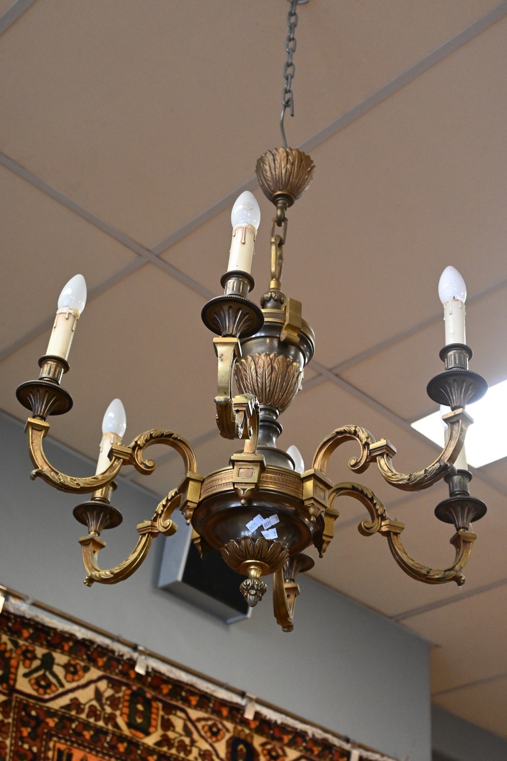 AN FRENCH ORMOLU BRONZE 19TH CENTURY SIX BRANCH CHANDELIER ( 80H X 60W CM) (PLEASE NOTE THIS HEAVY ITEM MUST BE REMOVED BY CARRIERS AT THE CUSTOMER'S EXPENSE. LEONARD JOEL STAFF CANNOT ASSIST CARRYING THIS ITEM) (X-LARGE ITEM)