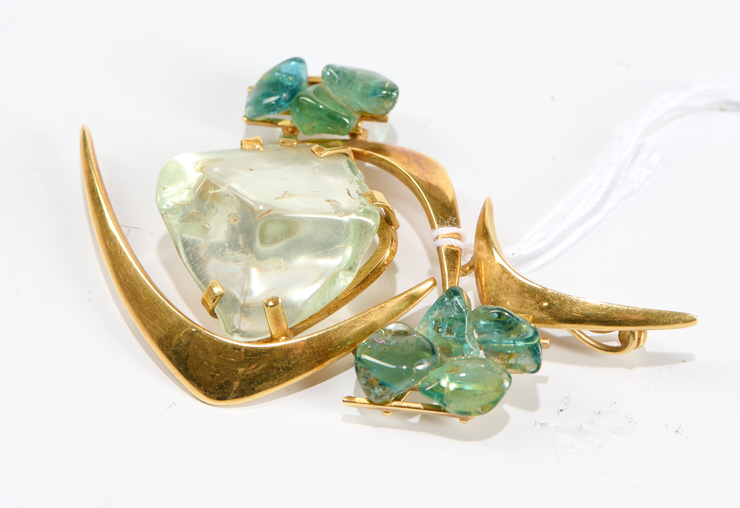 A TUMBLED EMERALD PENDANT IN 18CT GOLD, IN ABSTRACT FORM, 64 X 40MM