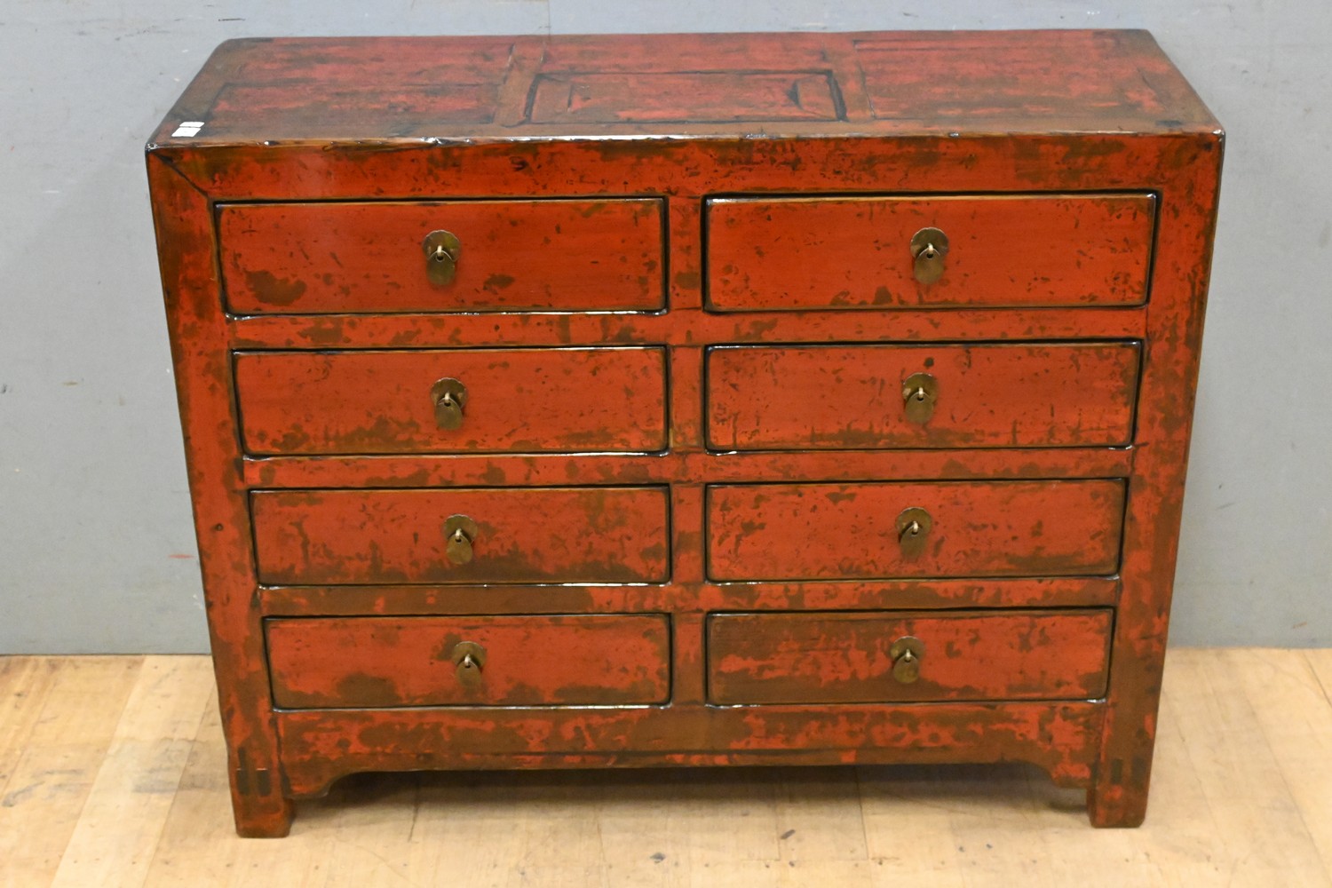 A CHINESE RED LAQUERED EIGHT DRAWER CHEST (H88 X W111 X D41 CM) (PLEASE NOTE THIS HEAVY ITEM MUST BE REMOVED BY CARRIERS AT THE CUSTOMER'S EXPENSE. LEONARD JOEL STAFF CANNOT ASSIST CARRYING THIS ITEM) (X-LARGE ITEM)