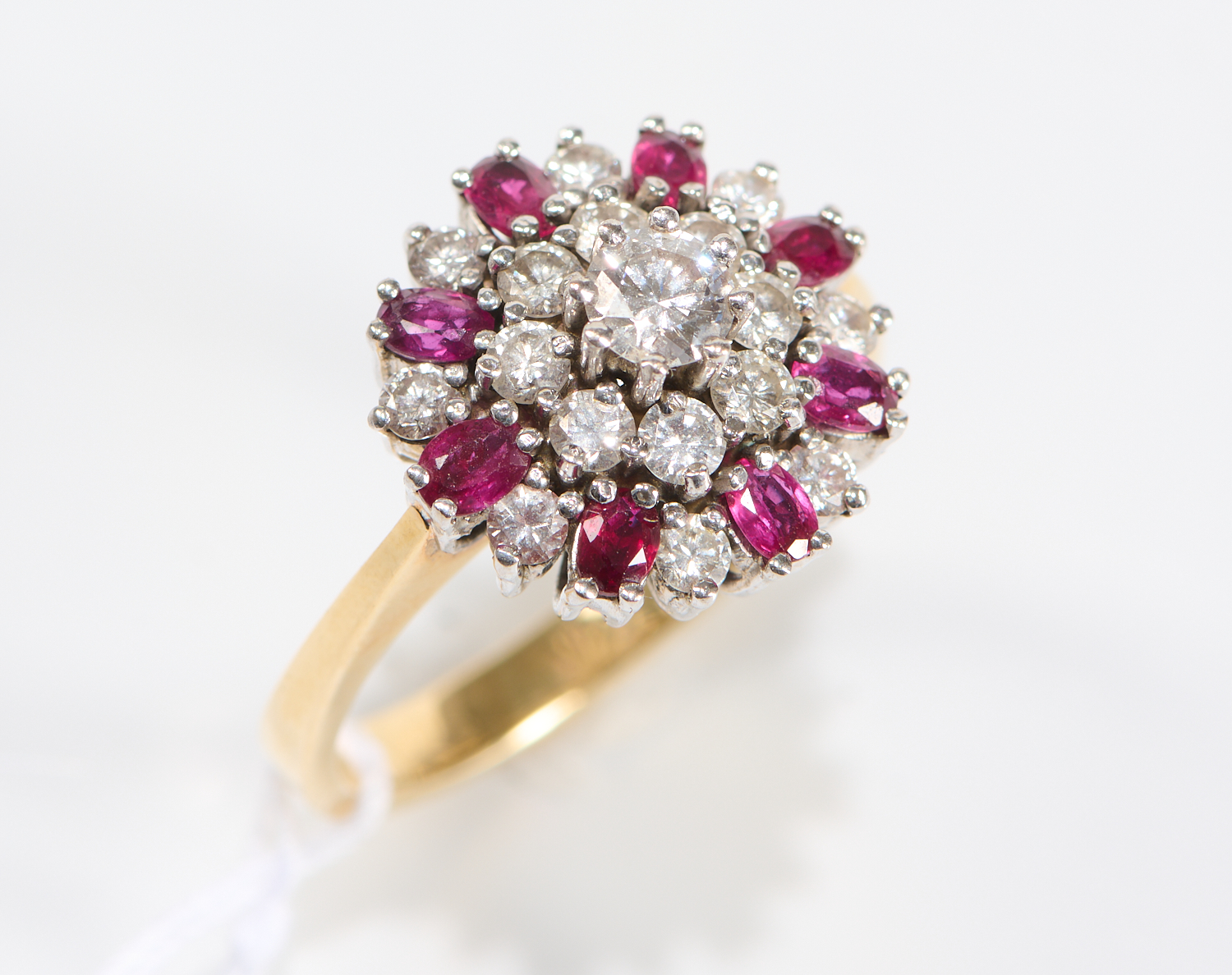 A RUBY AND DIAMOND CLUSTER RING IN 14CT WHITE GOLD, WITH BAND IN 18CT GOLD, 5.8GMS