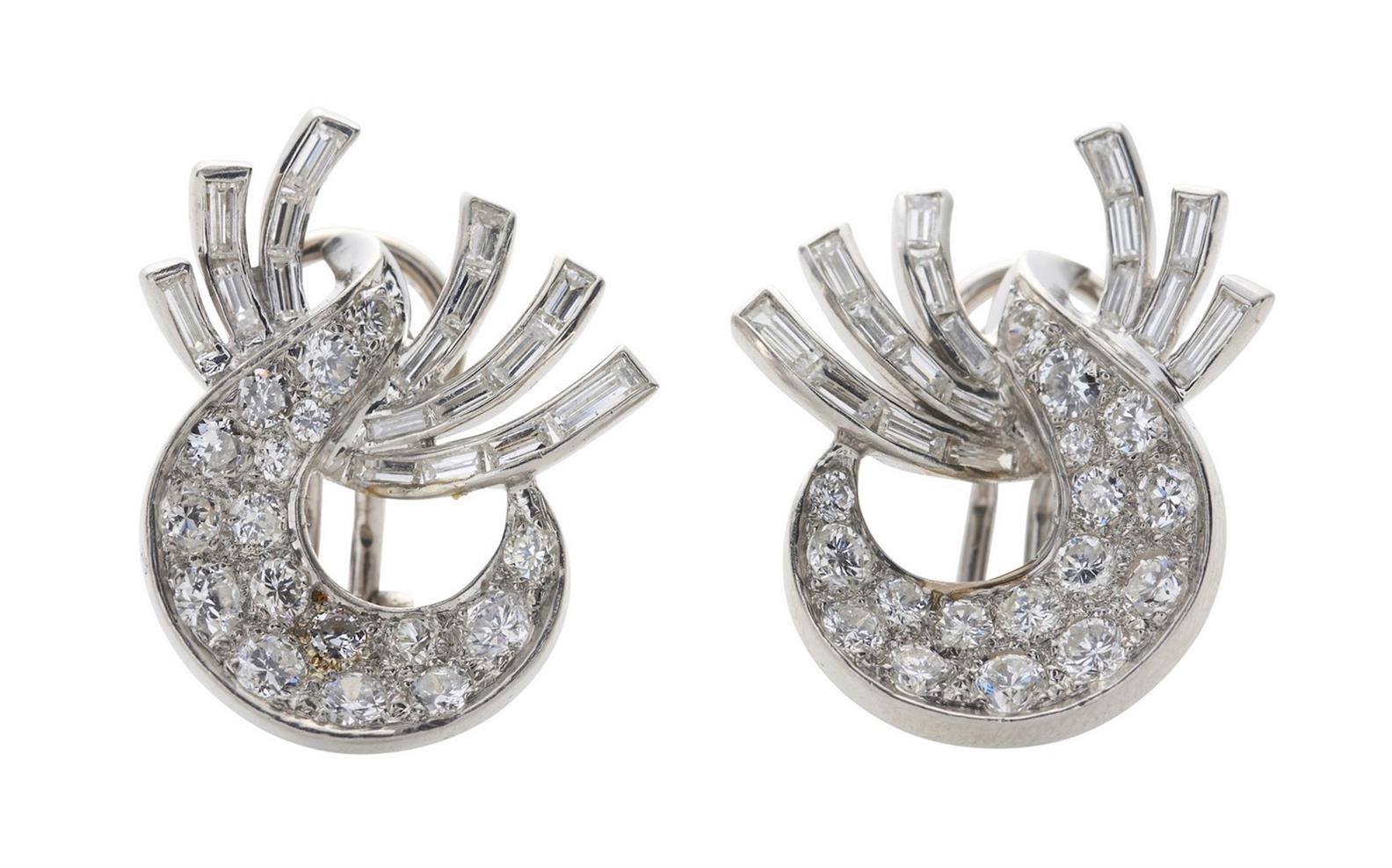 Of retro design, each earring composed of tapered baguette and round brilliant-cut diamonds together weighing approximately 1.20 carats, to clip fittings, length 23mm.