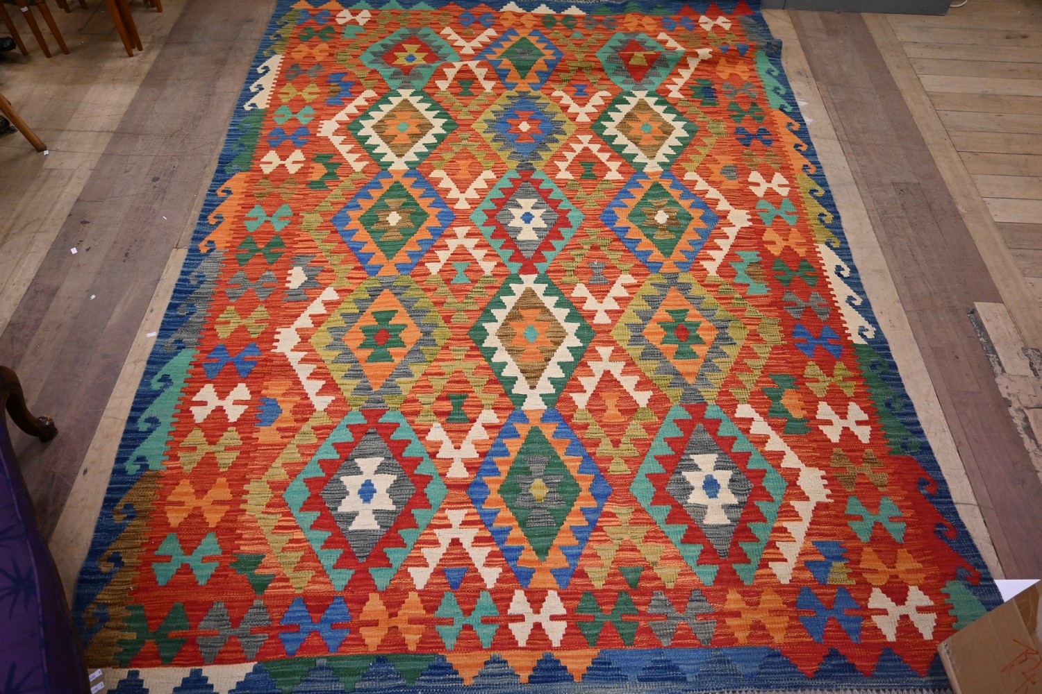AN AFGHAN KAZAK KILIM, ALL HAND WOVEN, 100% PURE WOOL VEGETABLE DYES, GEOMETRIC AND CAUCASIAN DESIGN, REVERSABLE, BRAND NEW (254 x 181 CM) (LEONARD JOEL DELIVERY SIZE: LARGE)