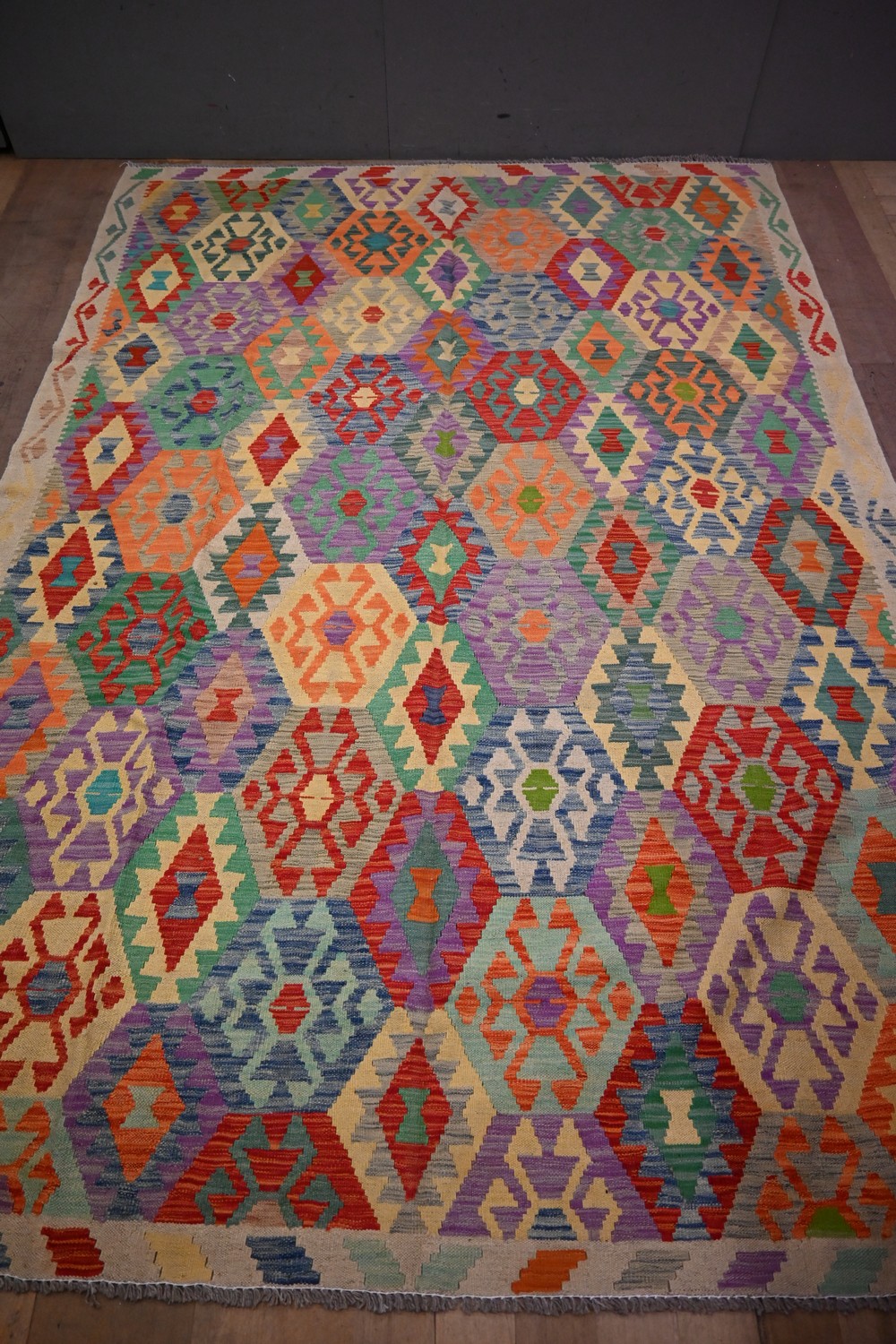 AN AFGHAN KAZAK KILIM, ALL HAND WOVEN, 100% PURE WOOL VEGETABLE DYES, GEOMETRIC AND CAUCASIAN DESIGN, REVERSABLE, BRAND NEW ( 298 X 204 CM) (LEONARD JOEL DELIVERY SIZE: LARGE)