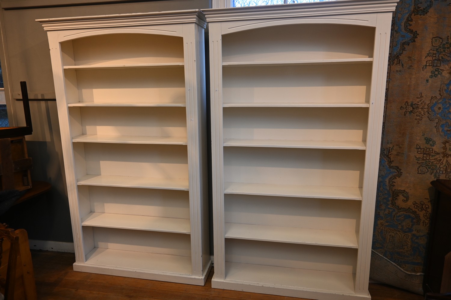 A PAIR OF WHITE PAINTED BOOKCASES (A/F) (215H x 138W x 31D CM) (PLEASE NOTE THIS HEAVY ITEM MUST BE REMOVED BY CARRIERS AT THE CUSTOMER'S EXPENSE. LEONARD JOEL STAFF CANNOT ASSIST CARRYING THIS ITEM) (X-LARGE ITEM)