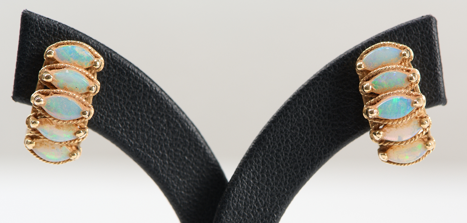 A PAIR OF OPAL SET EARRINGS TO POST AND LEVER BACK FITTINGS IN 14CT GOLD, 4.1GMS
