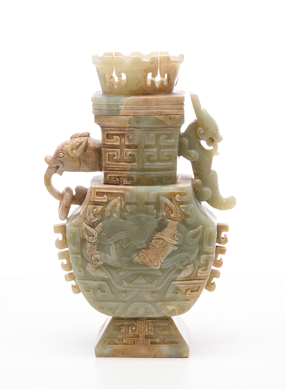 A CHINESE ARCHAISTIC CELADON JADE COVERED VASE