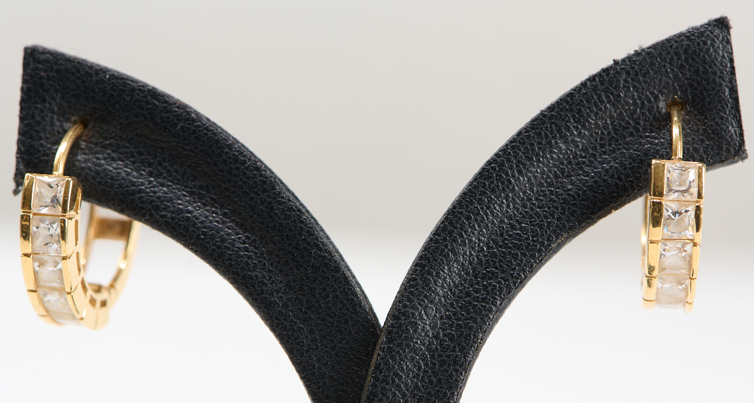 A PAIR OF CUBIC ZIRCONIAN SET HOOP EARRINGS IN 18CT GOLD, TO POST FITTINGS, DIAMETER APPROXIMATELY 18MM, 4.82GMS