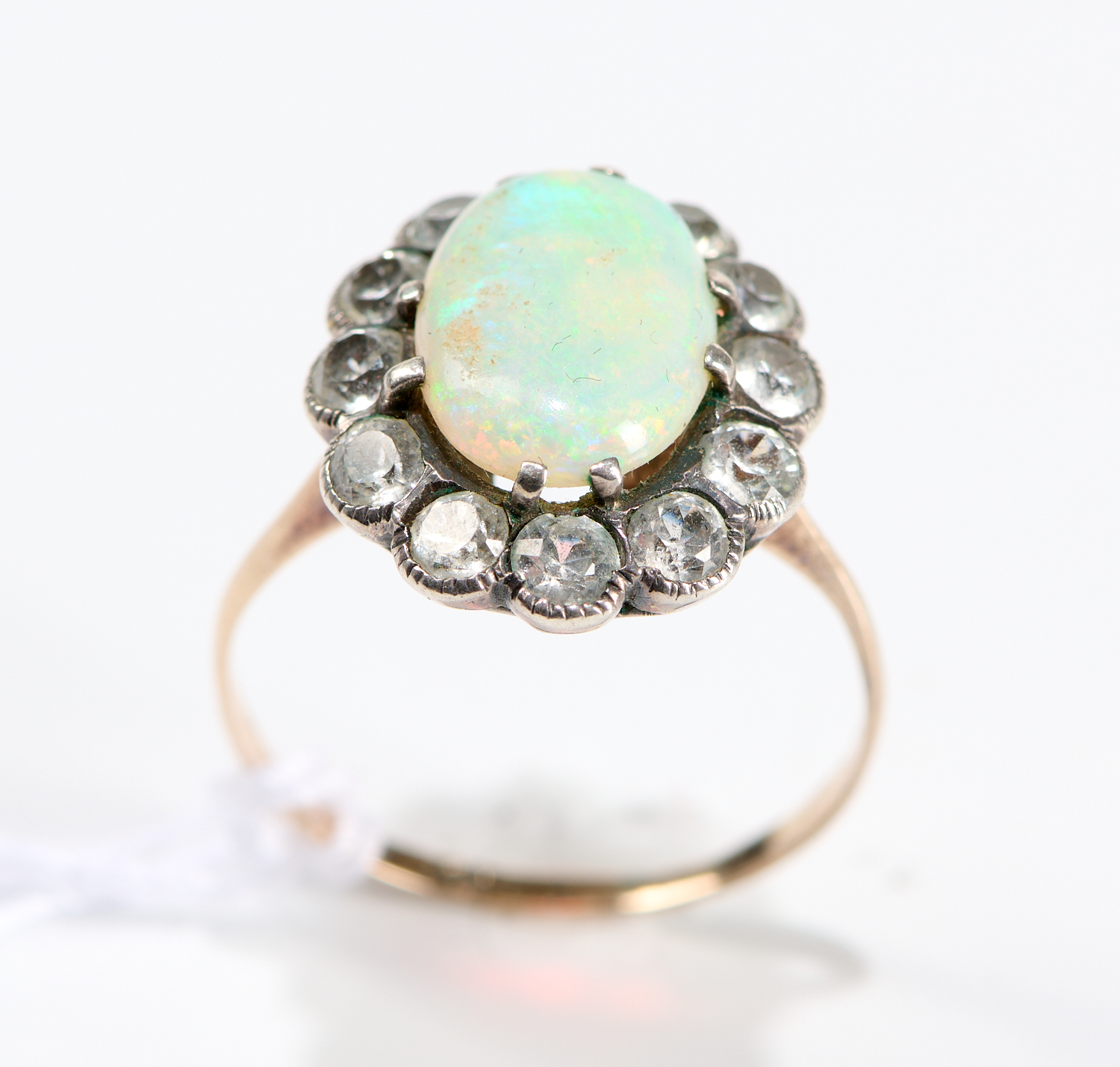AN OPAL AND PASTE SET RING IN SILVER AND LOW CARAT GOLD, RING SIZE M/N