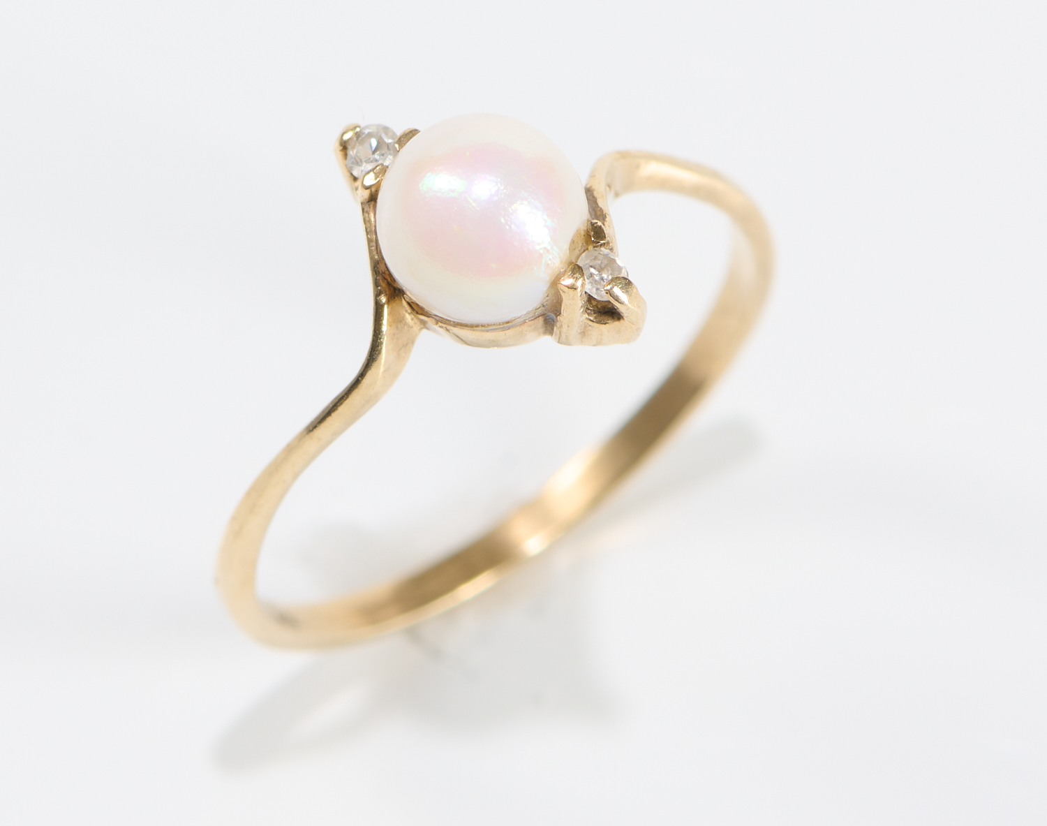 A PEARL AND DIAMOND RING IN 9CT GOLD, RING SIZE L/M, 1.2GMS