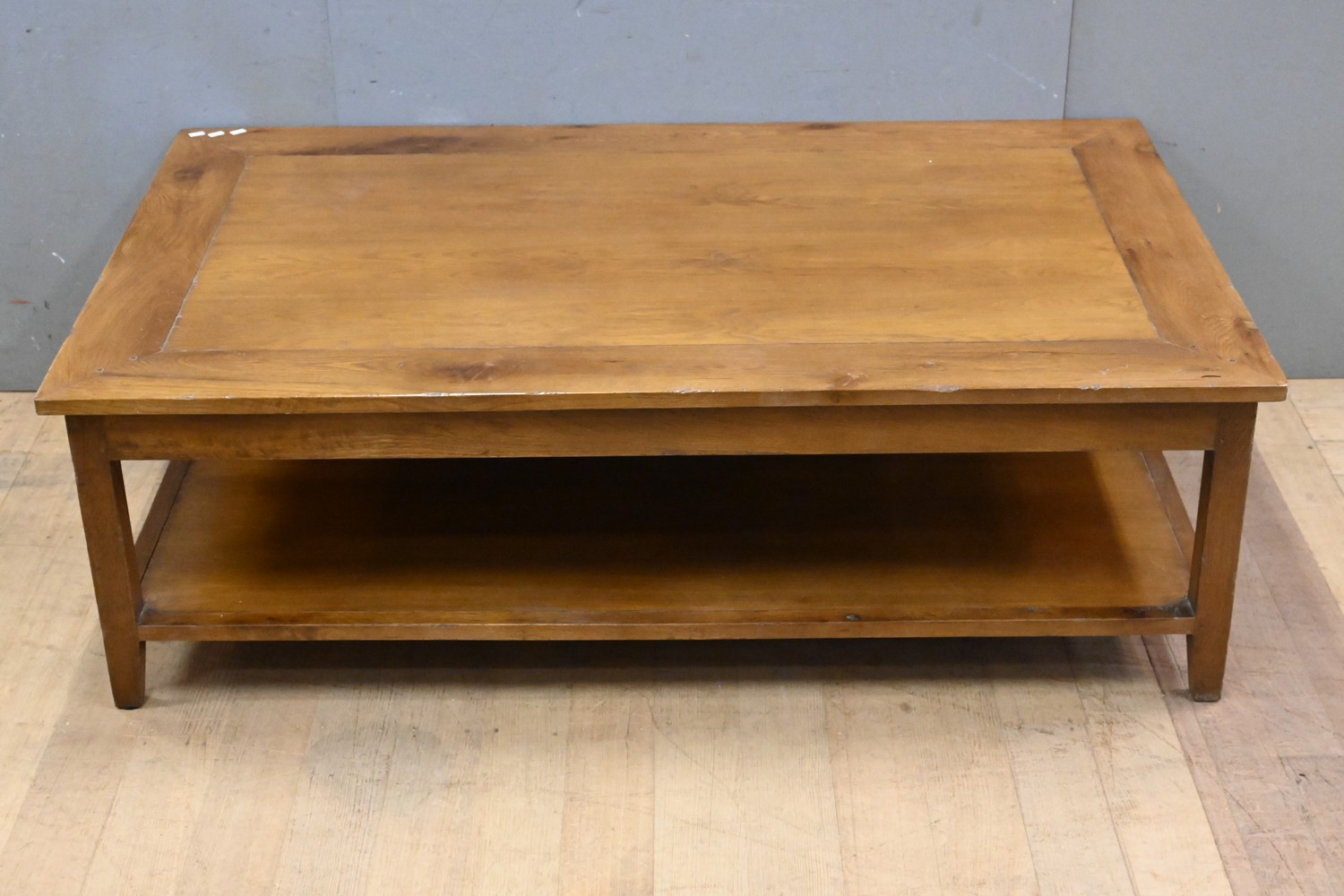 A SUBSTANTIAL TWO TIER OAK COFFEE TABLE (45H x 145W x 90D CM) (PLEASE NOTE THIS HEAVY ITEM MUST BE REMOVED BY CARRIERS AT THE CUSTOMER'S EXPENSE. LEONARD JOEL STAFF CANNOT ASSIST CARRYING THIS ITEM) (X-LARGE ITEM)